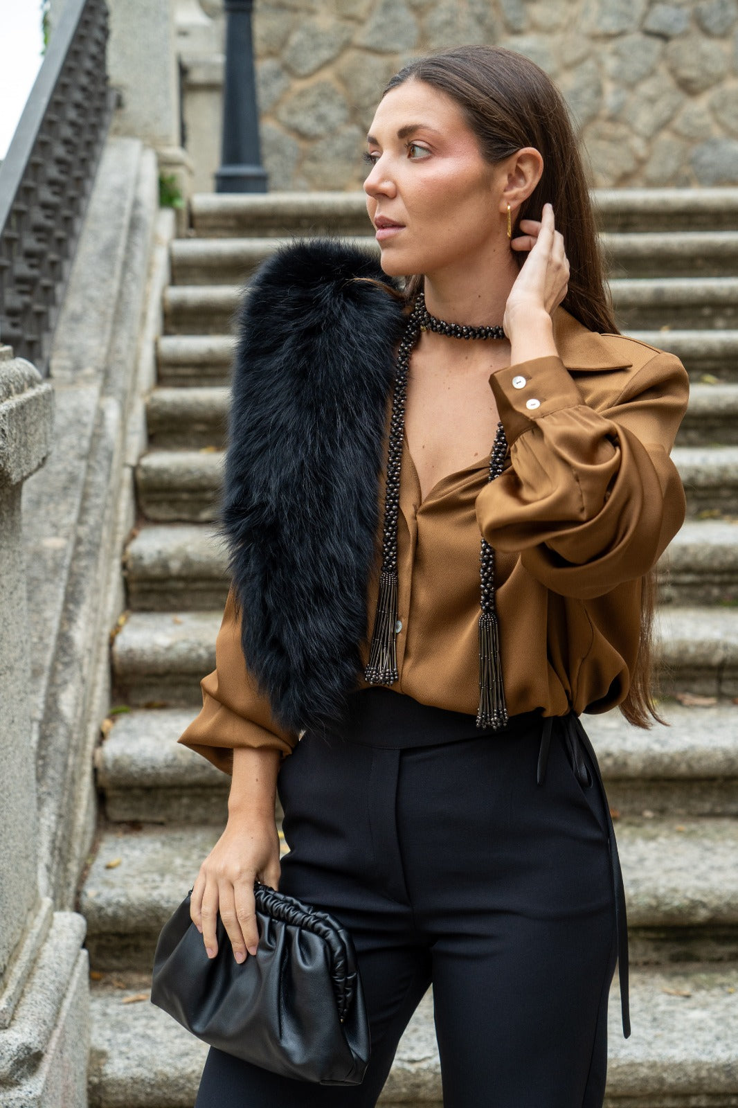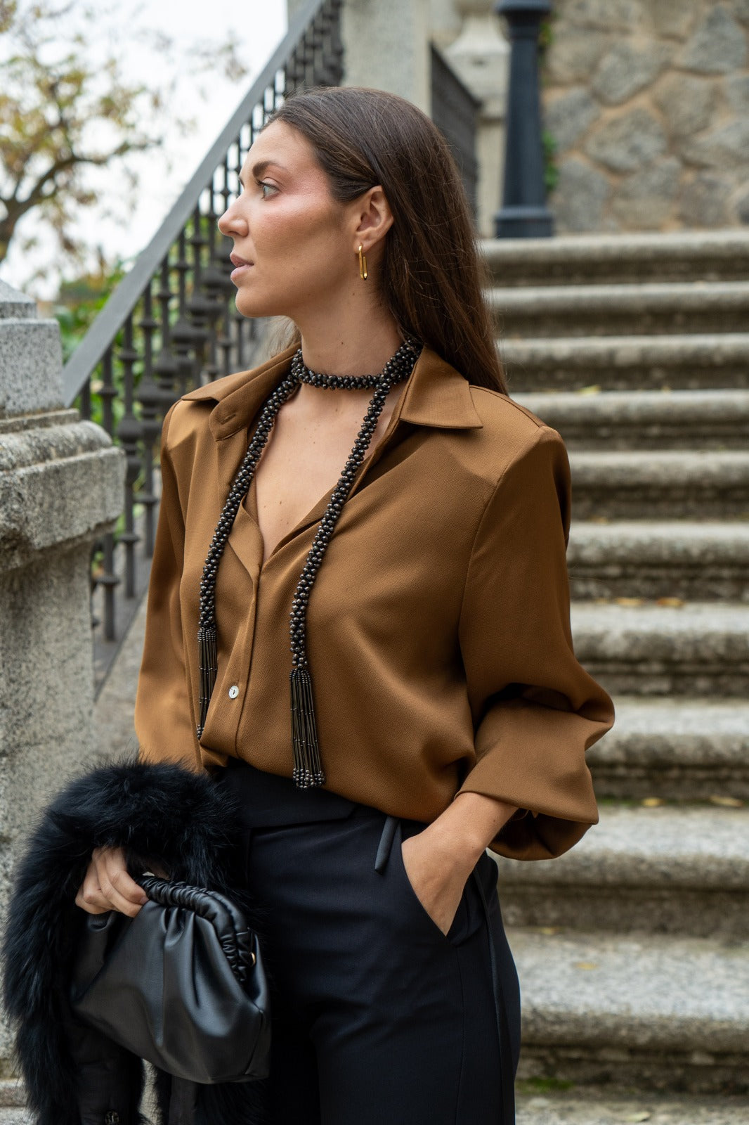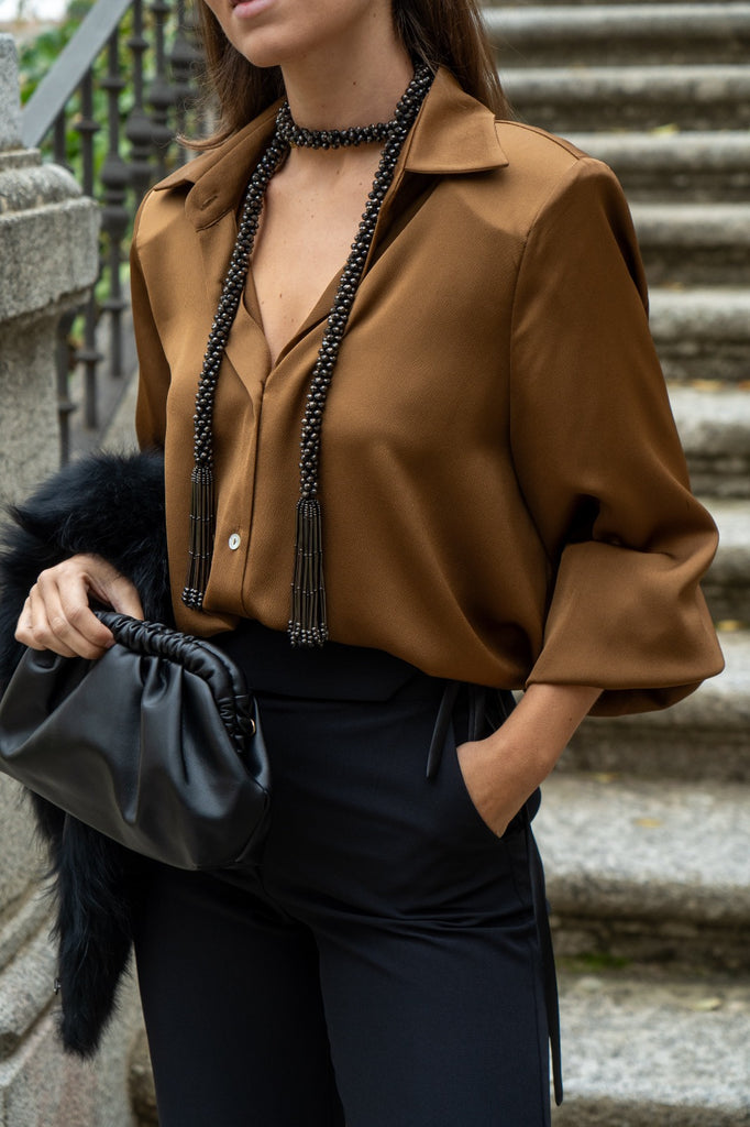 Camisa básica em cetim, manga comprida com punhos, botões em madrepérola, em castanho.