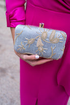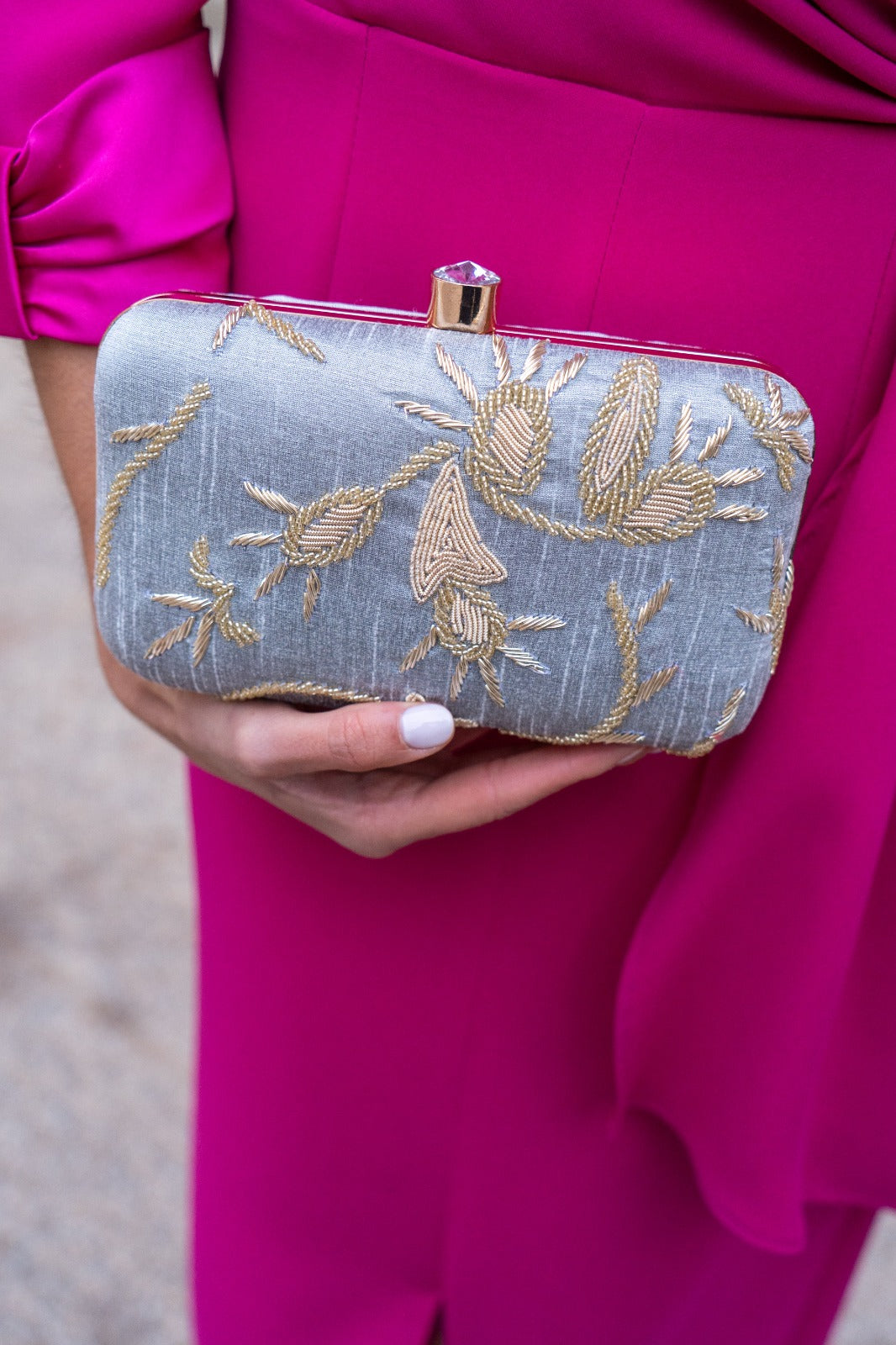 Bolso ovalado, con pomo dorado, cadena larga para colgar. Detalles bordados en color dorado.