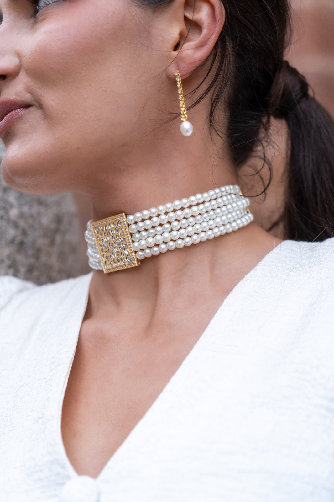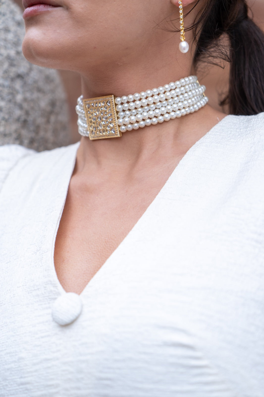 Chocker compuesto por cinco hileras de perlas perfectamente alineadas que abrazan el cuello con elegancia, culminando en un espectacular broche cuadrado con relieves.