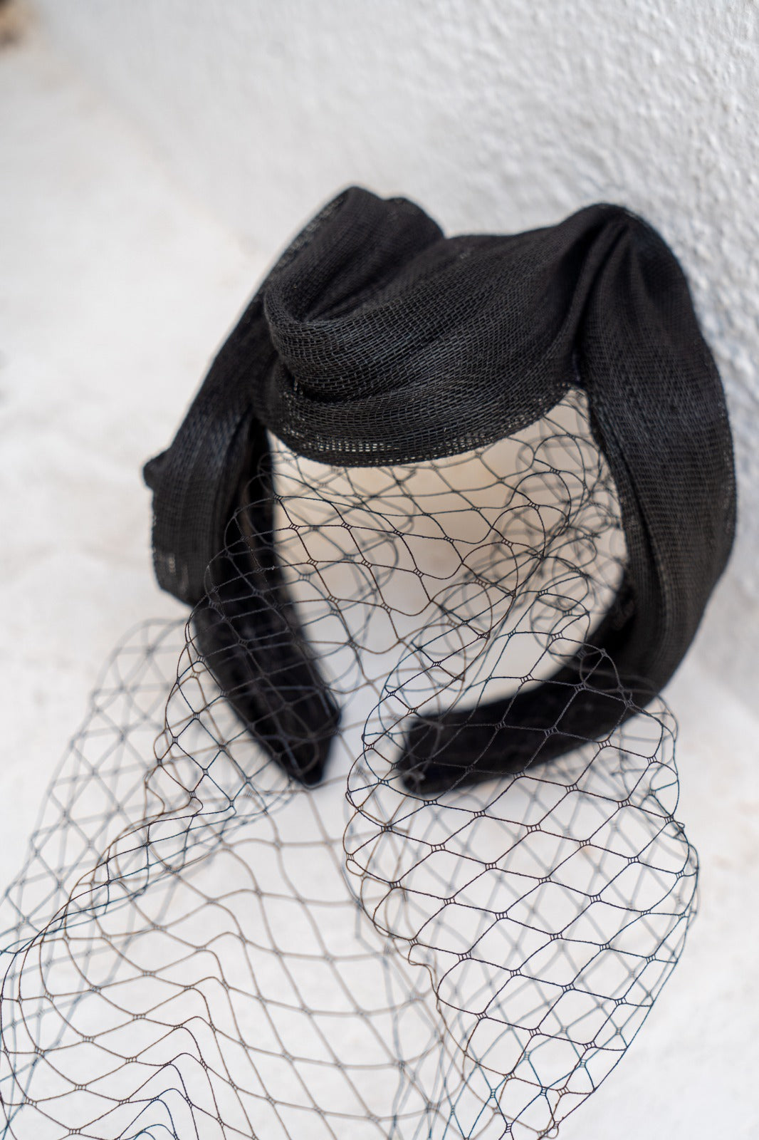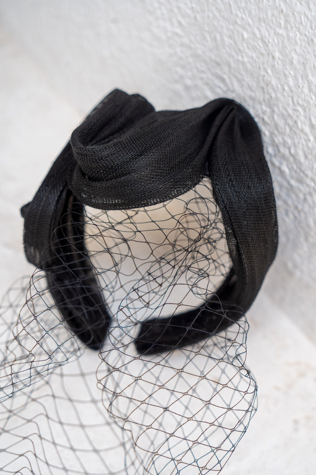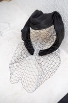 Faixa de cabeça sinamay de seda preta com malha preta.