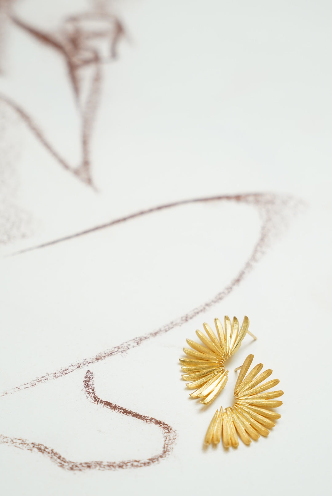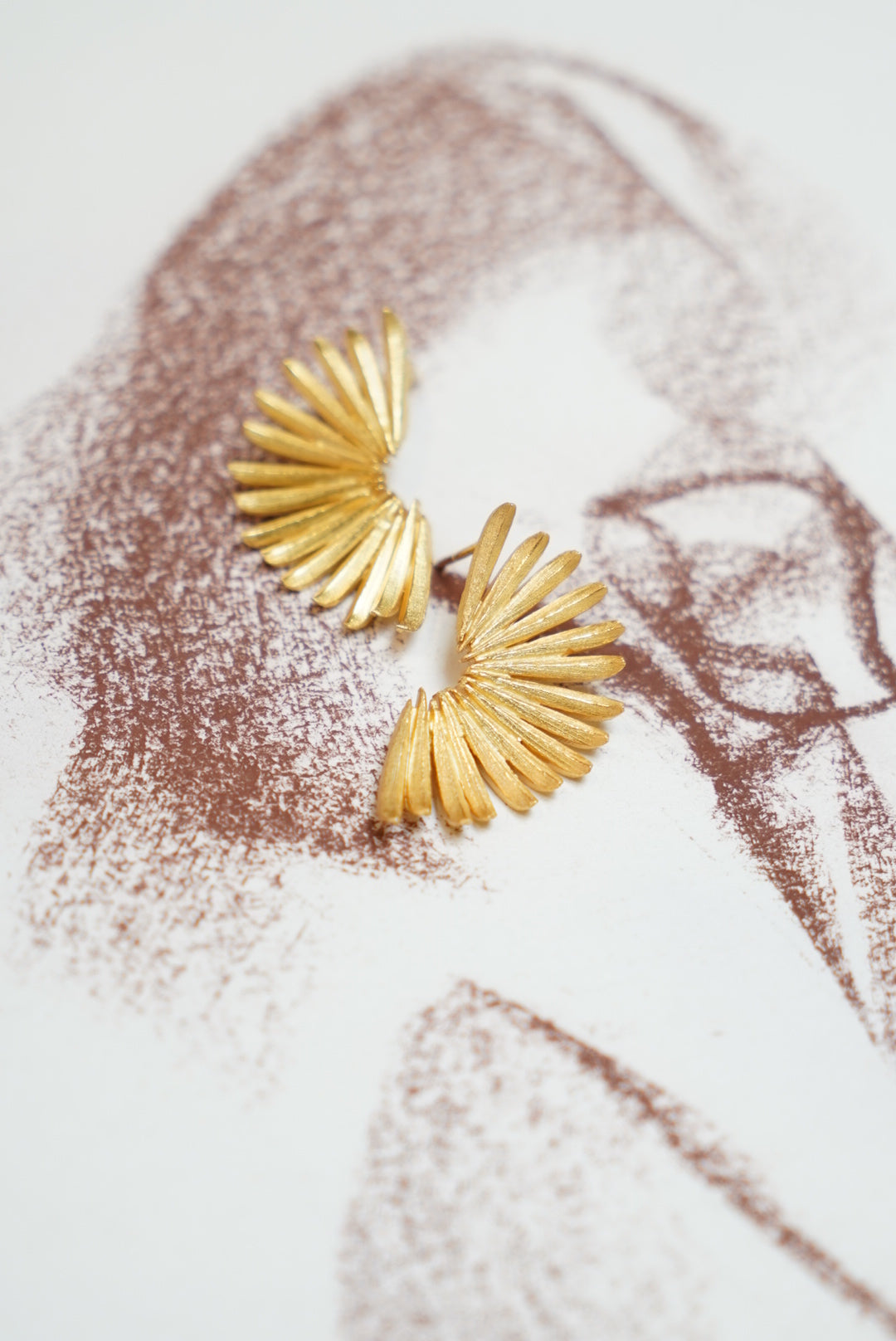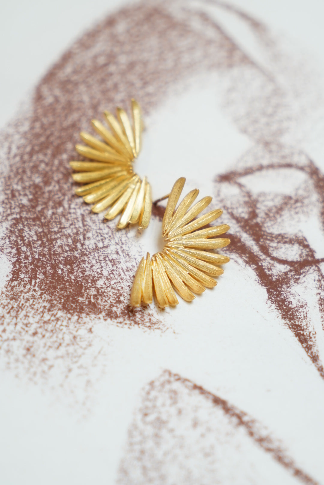 Brincos dourados com formato geométrico; muitas linhas sobrepostas regularmente, de comprimento semelhante. Brincos feitos à mão.
