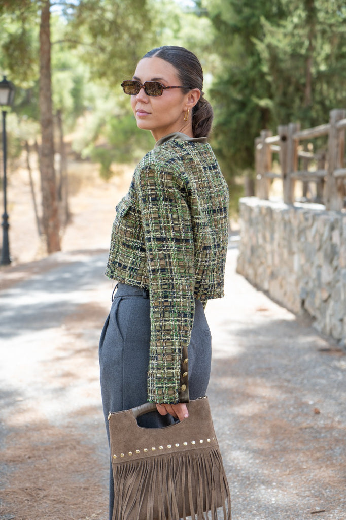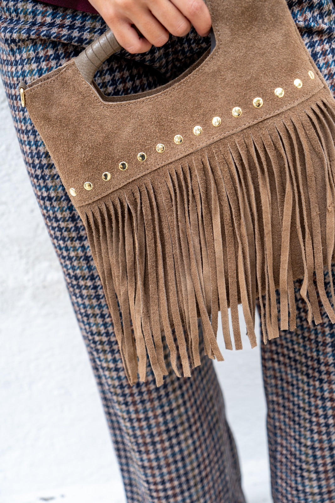 Bolsa em camurça castanha com fecho de correr, alça curta, franjas e detalhes de tachas.