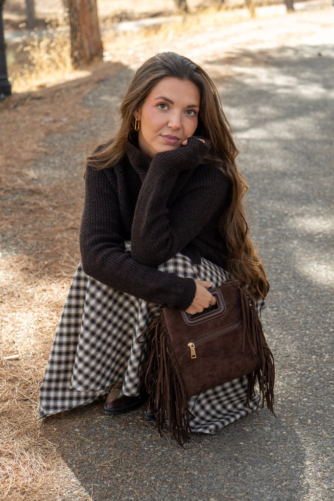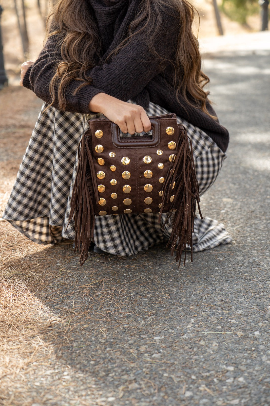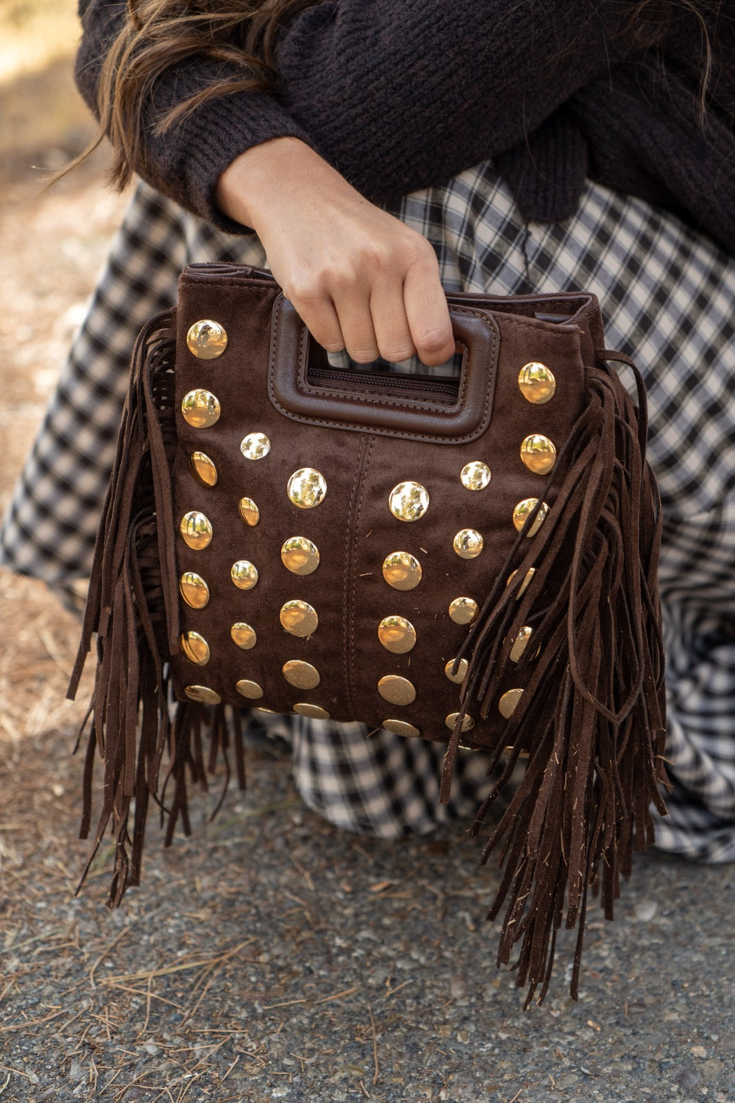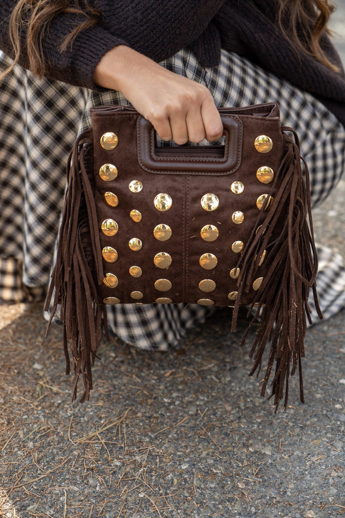 Bolsa em camurça castanha com fecho de correr, alça curta, detalhes de tachas e franjas nas laterais.