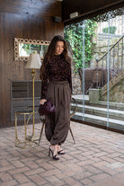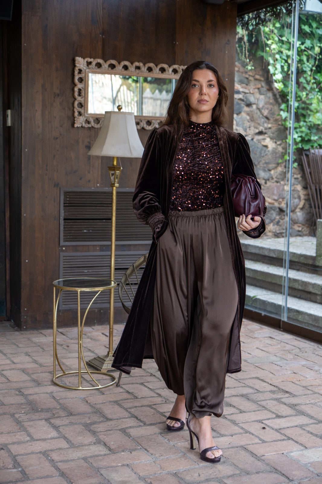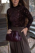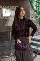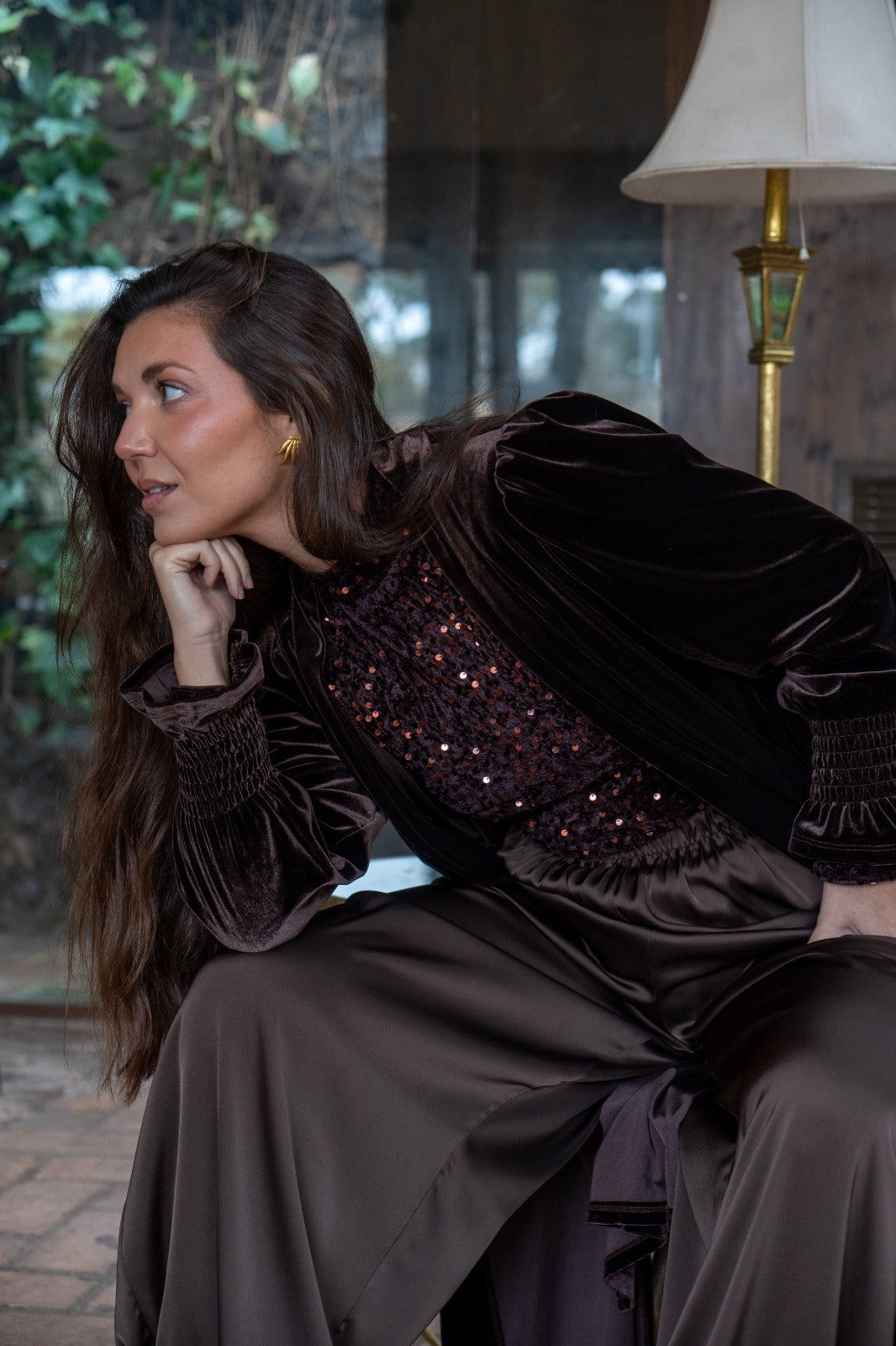 Body cuelo halter, manga larga, en color marrón con lentejuelas.