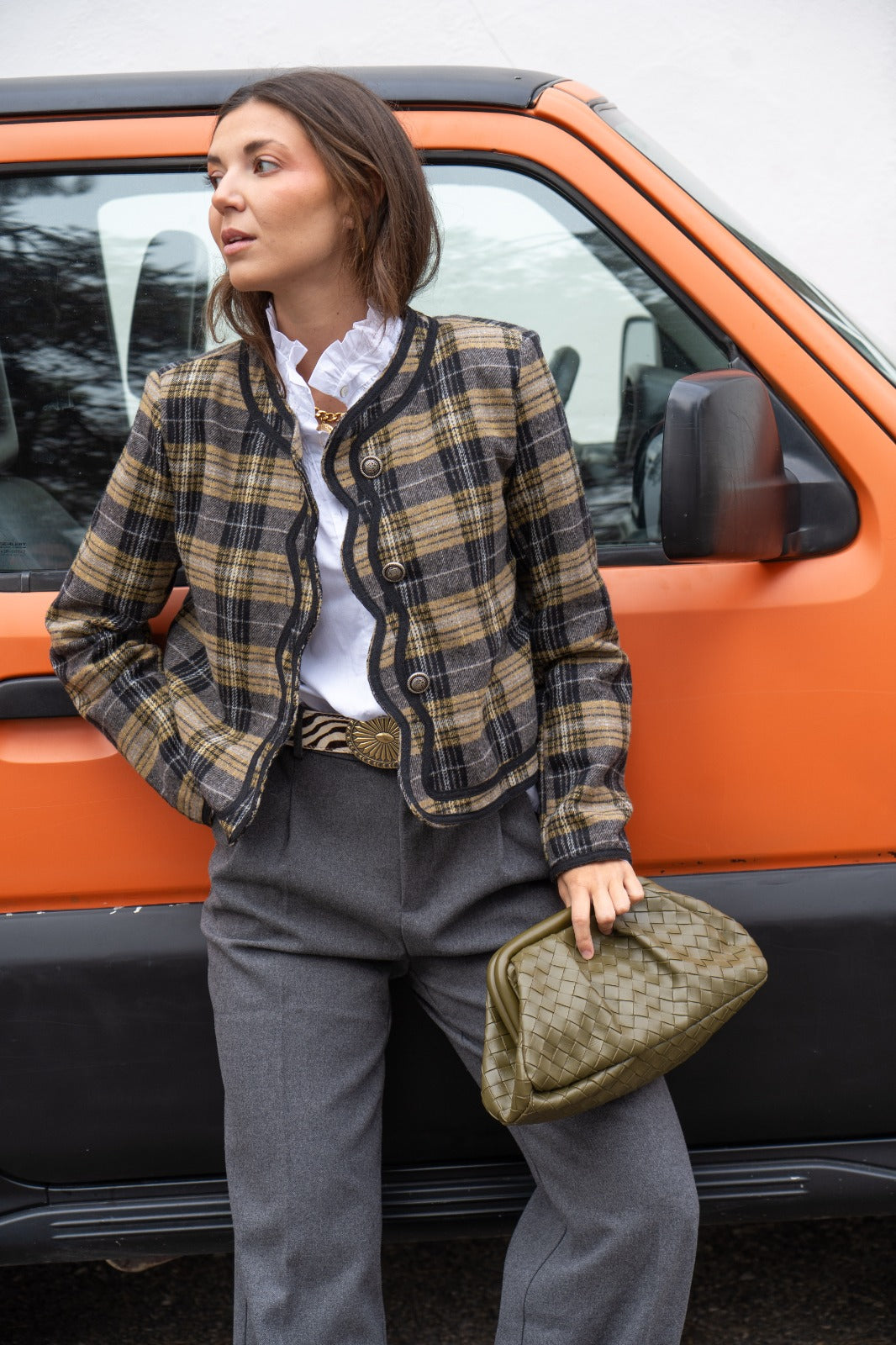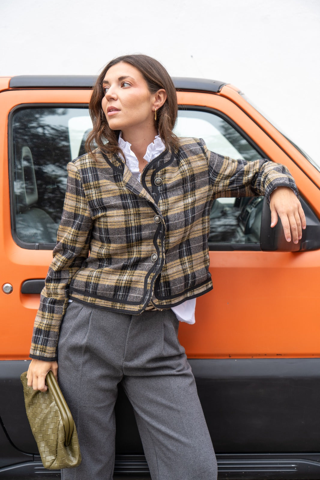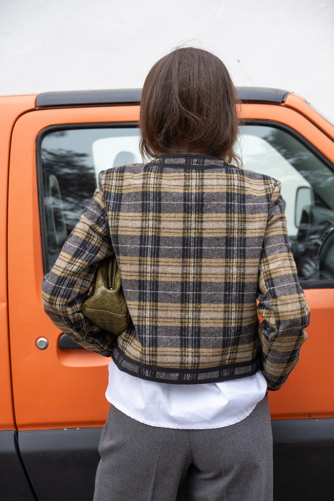 Casaco curto, gola redonda, manga comprida, fecho com botões, detalhe em preto na gola, em xadrez mostarda e cinza.