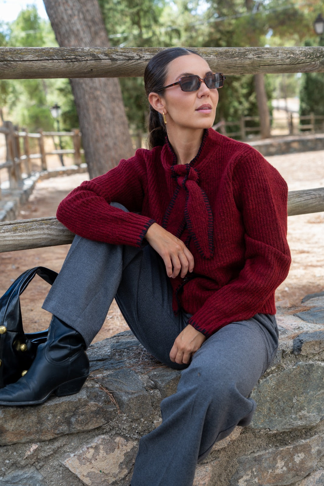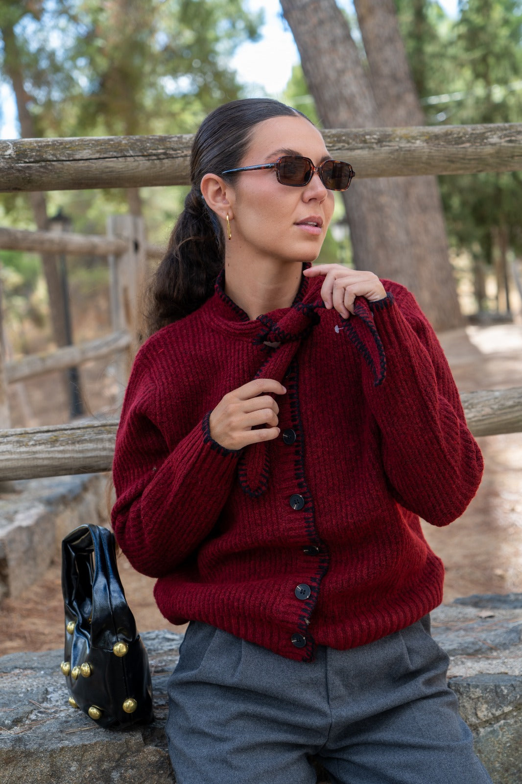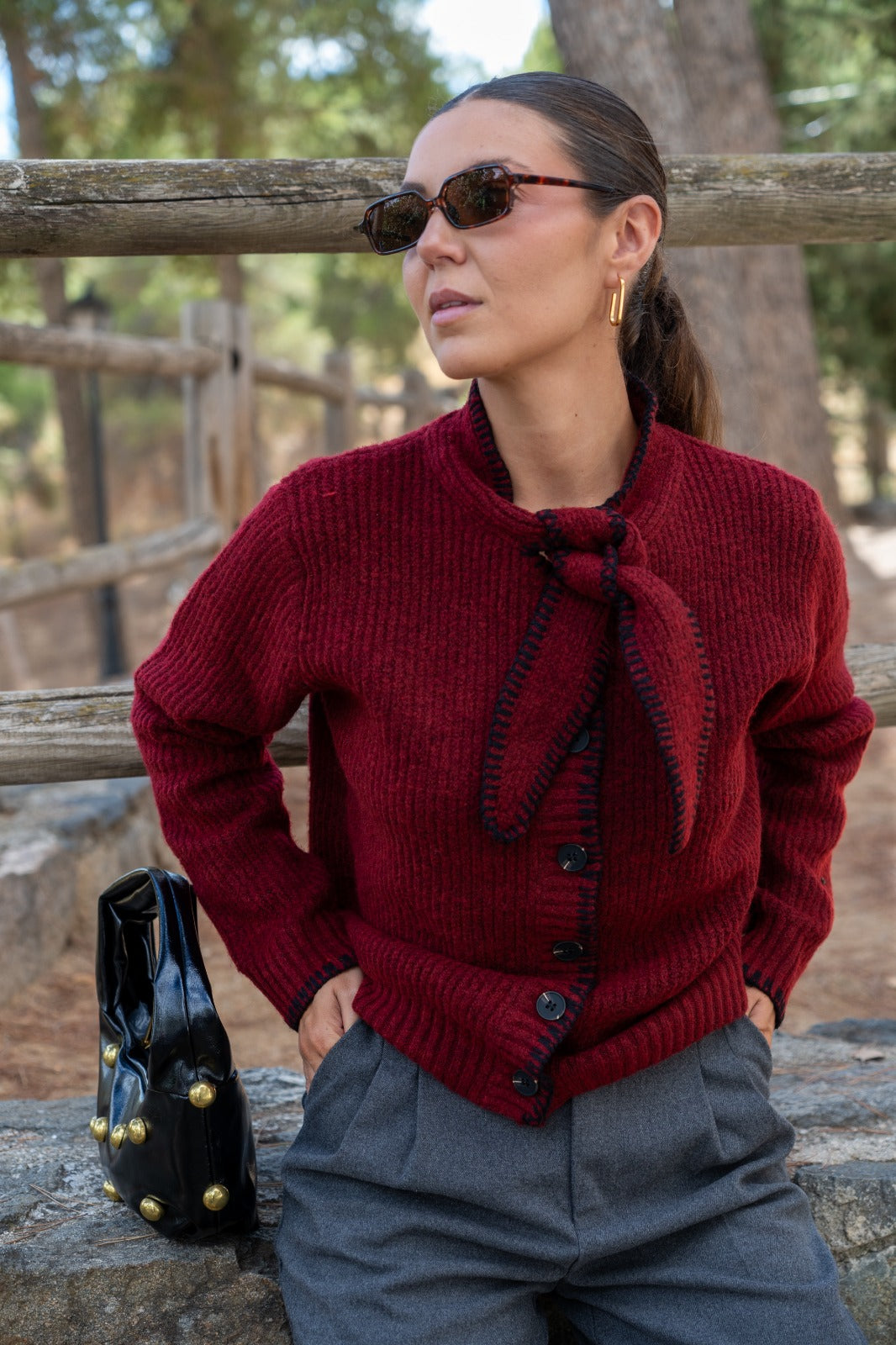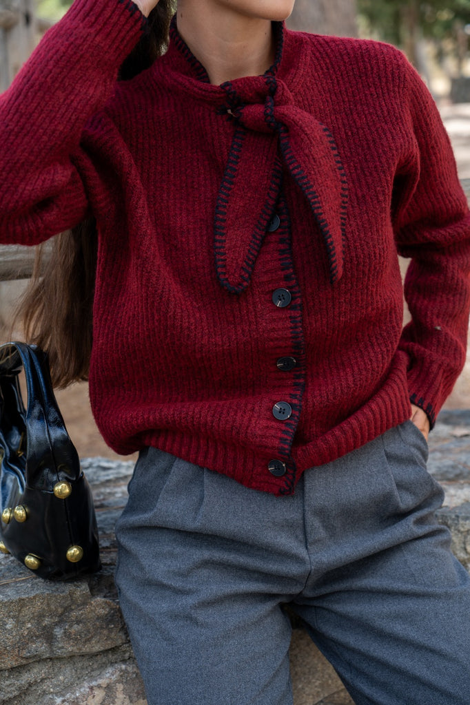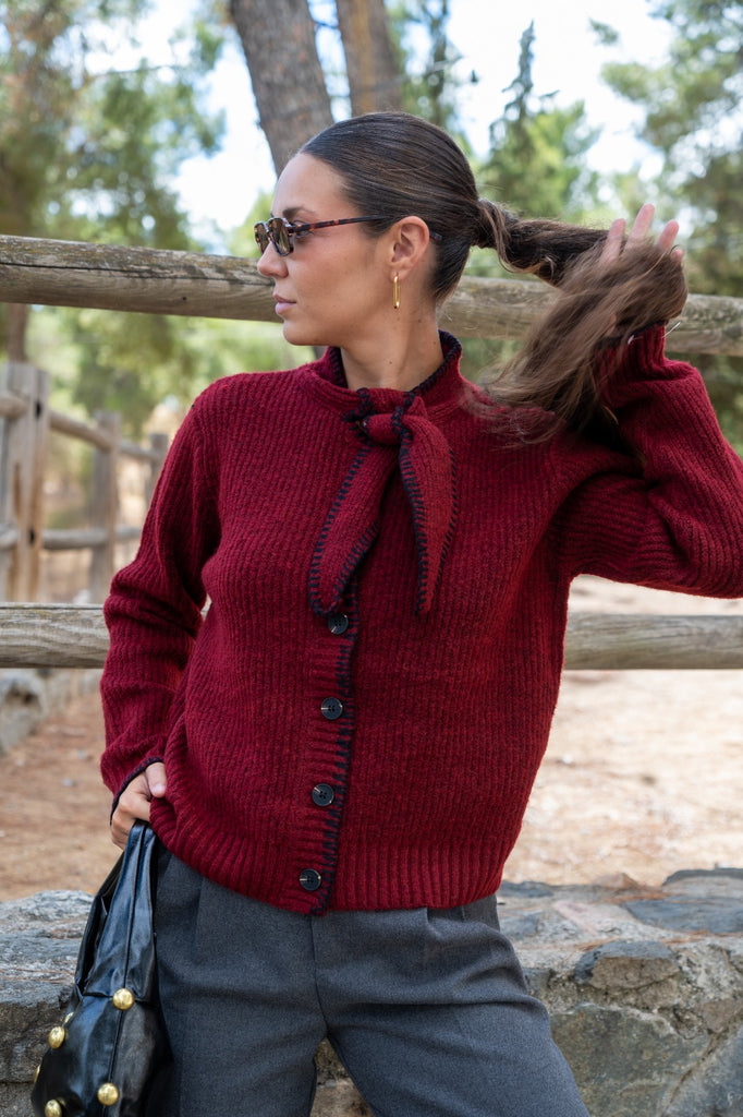 Casaco de malha, abotoado, com laço no pescoço, em cor bordeaux com detalhes de costura preta.