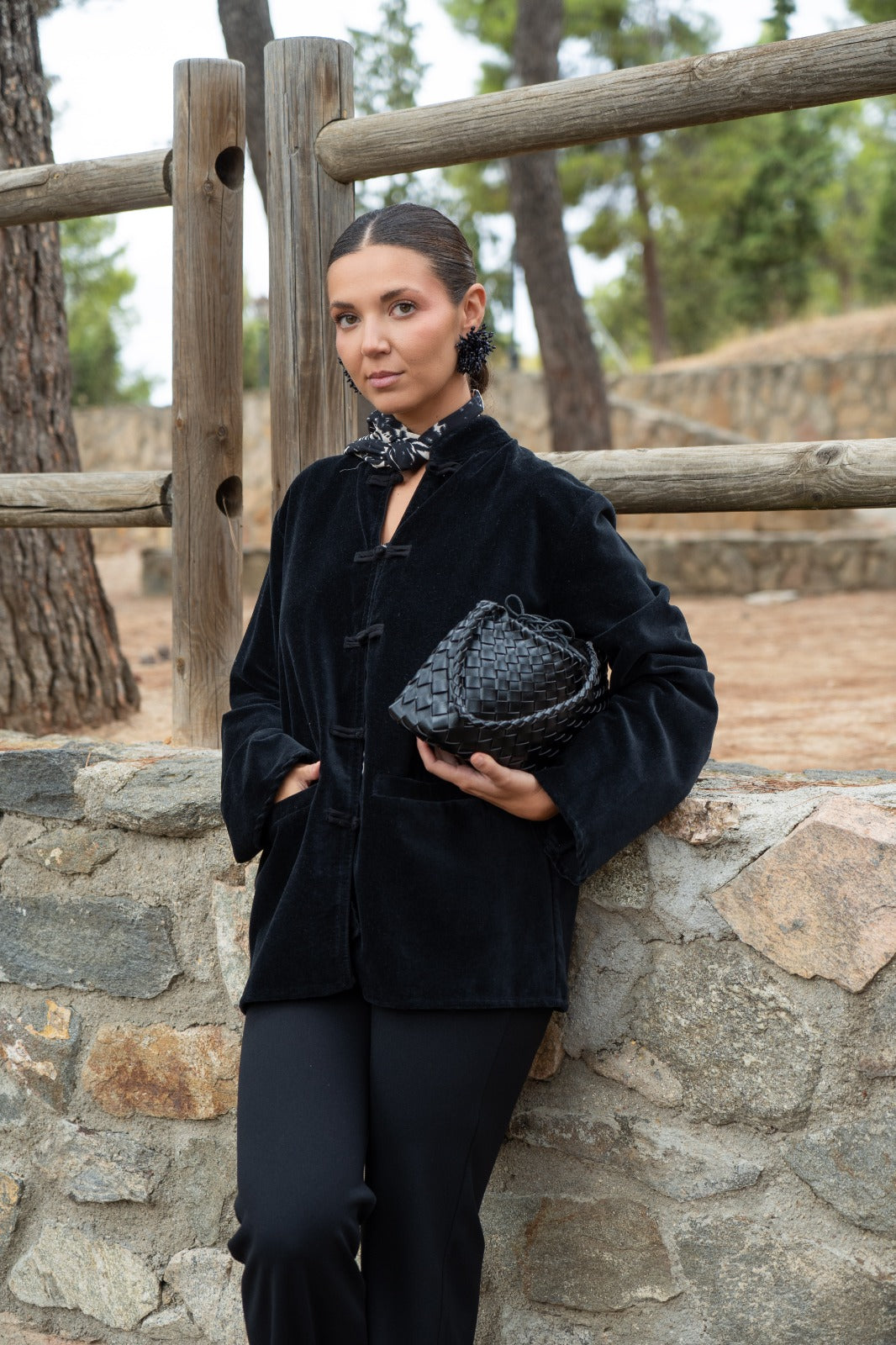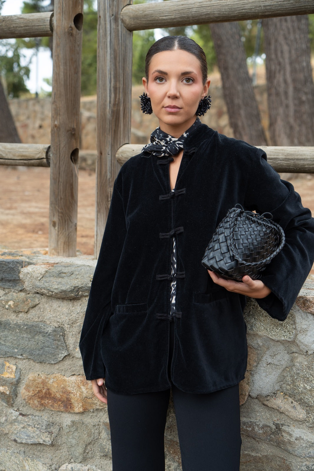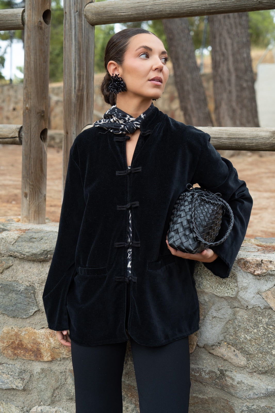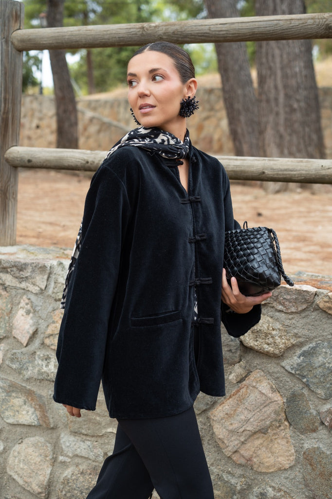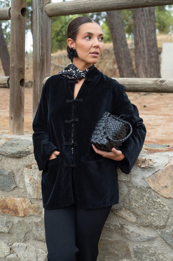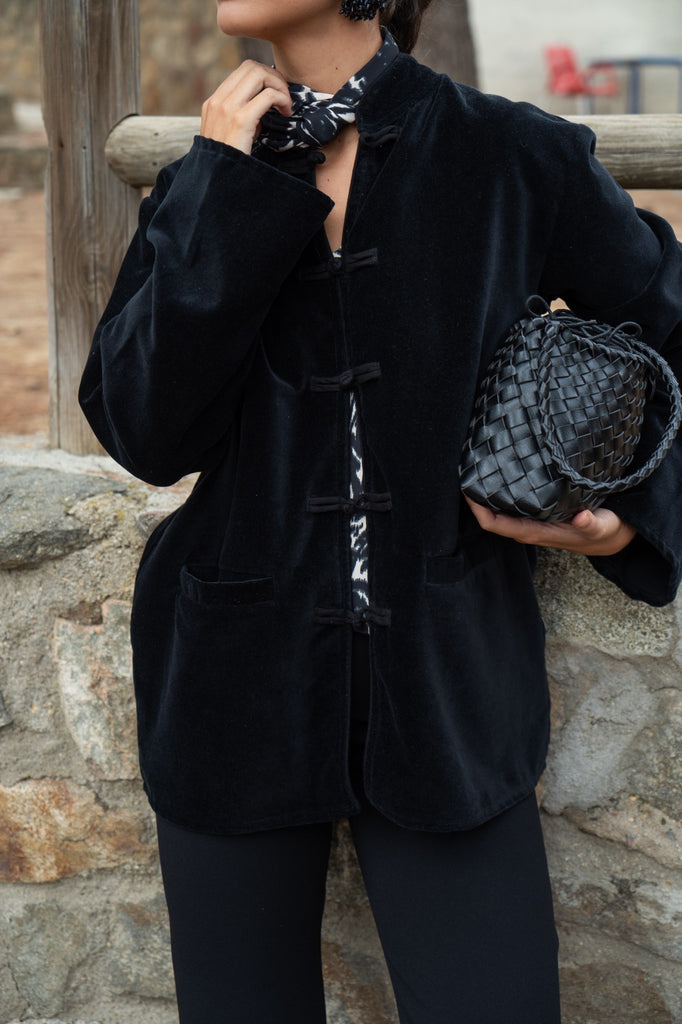 Camisa de forças, rachas laterais, mangas compridas, bolsos frontais. Em veludo preto.