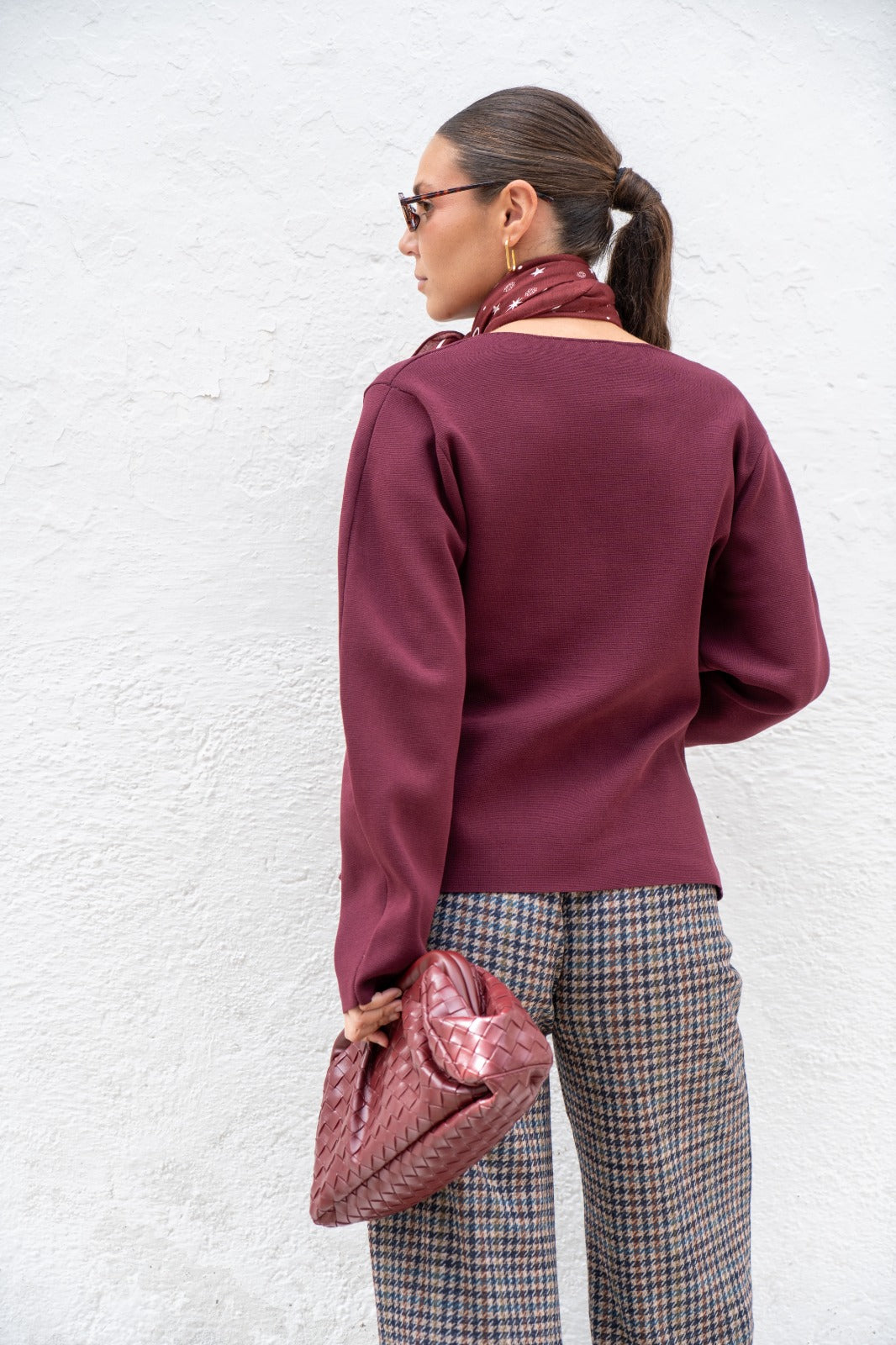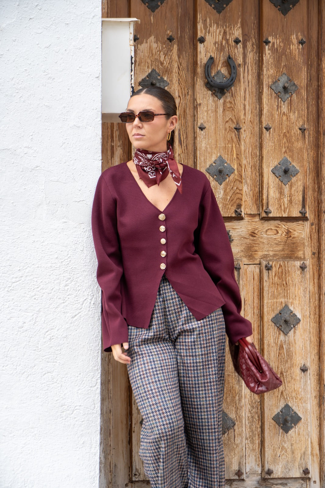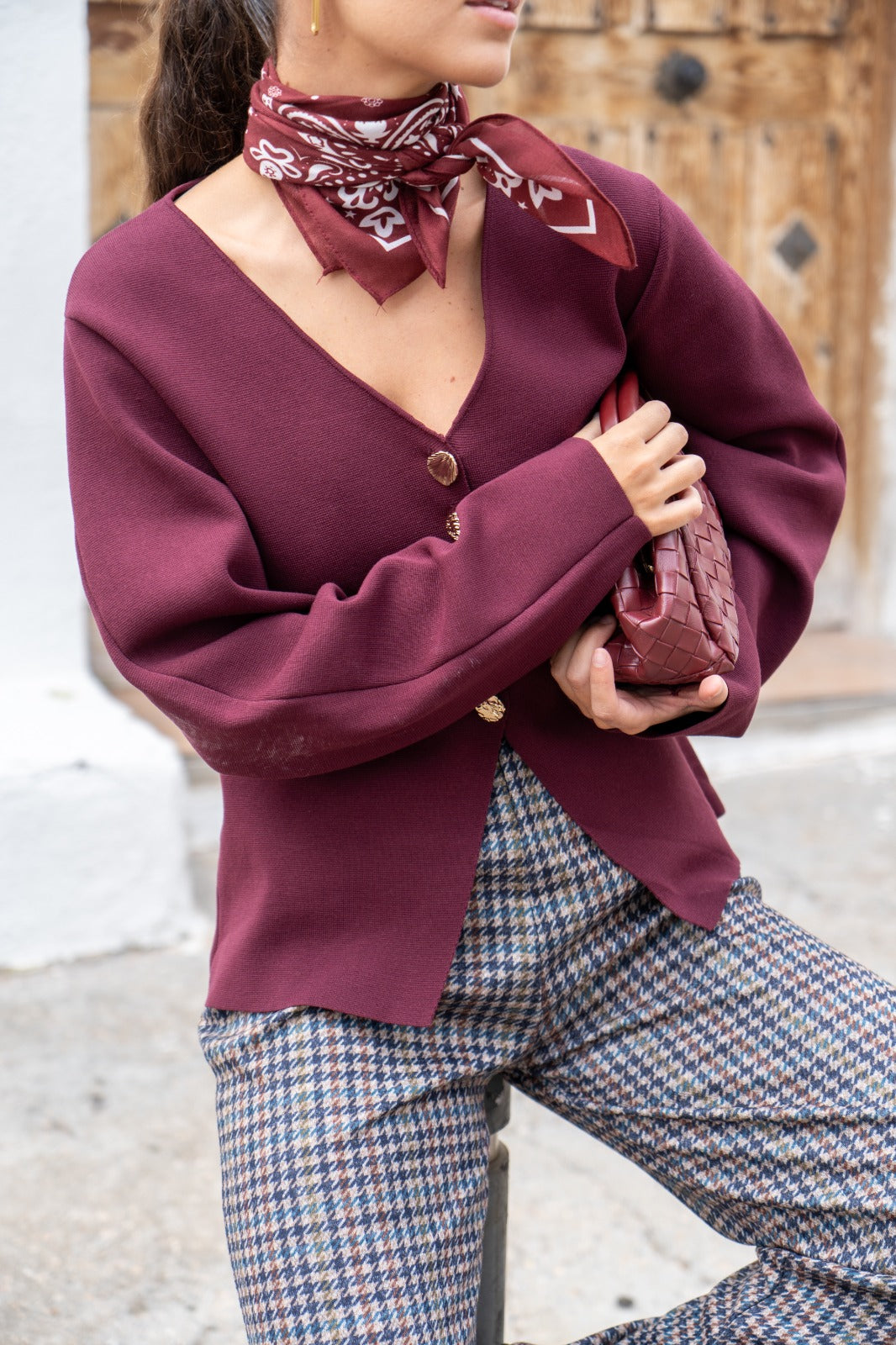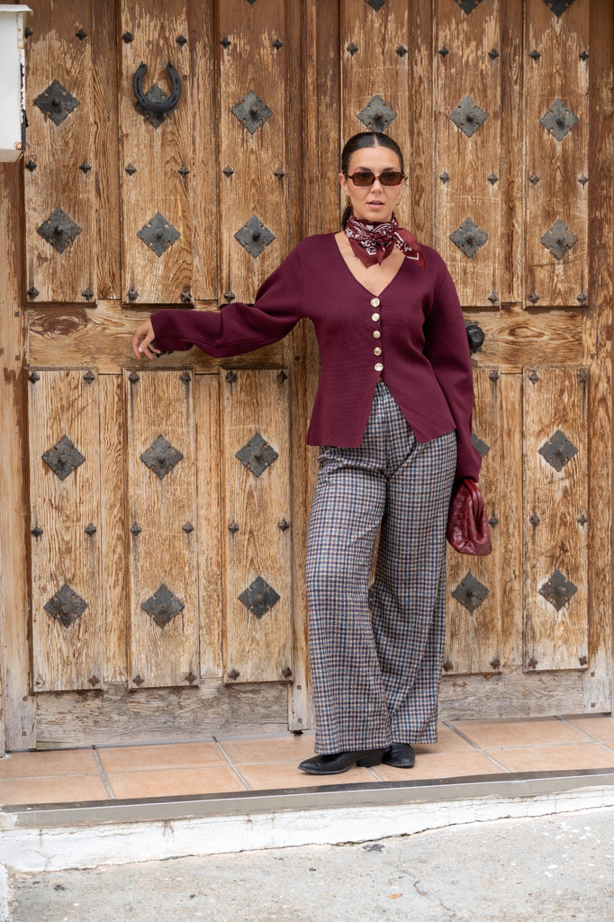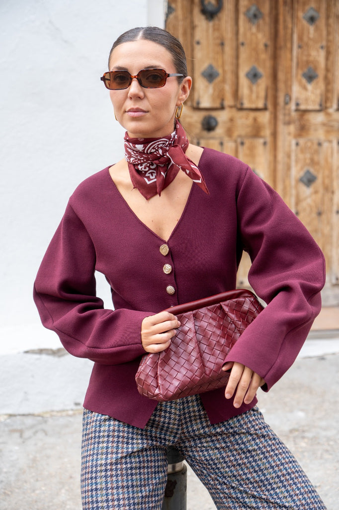 Casaco de malha com decote em V, mangas compridas e fecho de botões. Na cor bordeaux.
