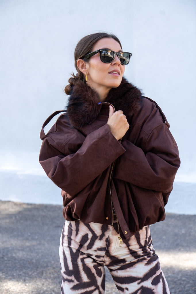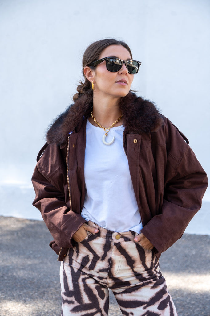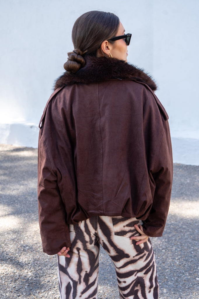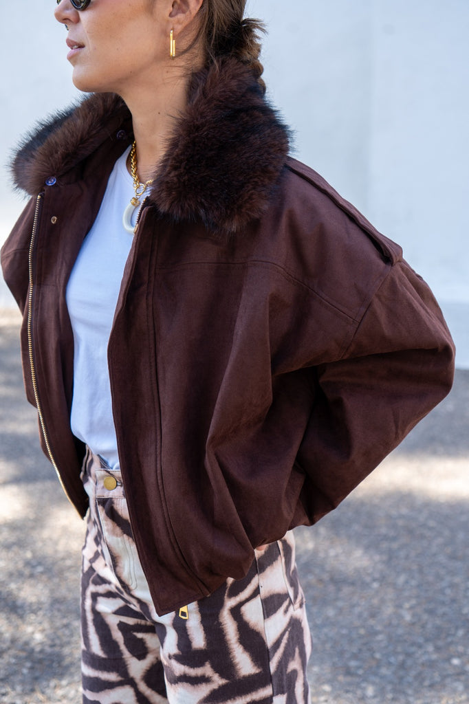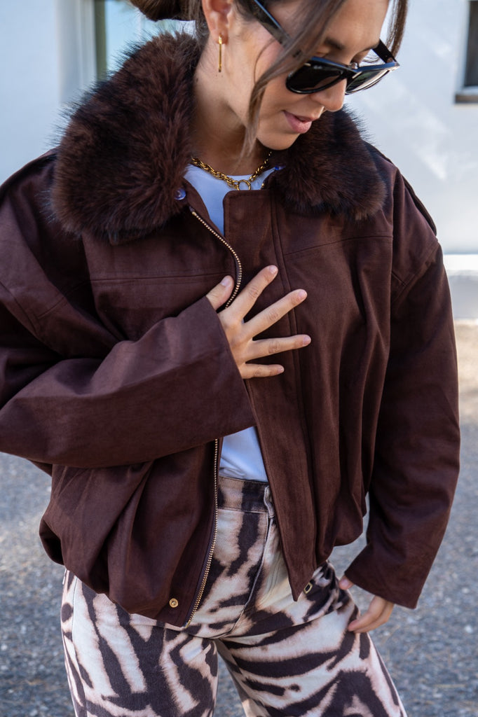 Casaco castanho em camurça, gola de lapela com gola de pele removível, fecho, elástico na base.