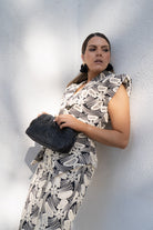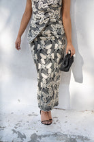 Conjunto composto por um colete com decote cruzado, ombreiras altas e saia de cintura alta com fenda nas costas. Preto com crochê bege.
