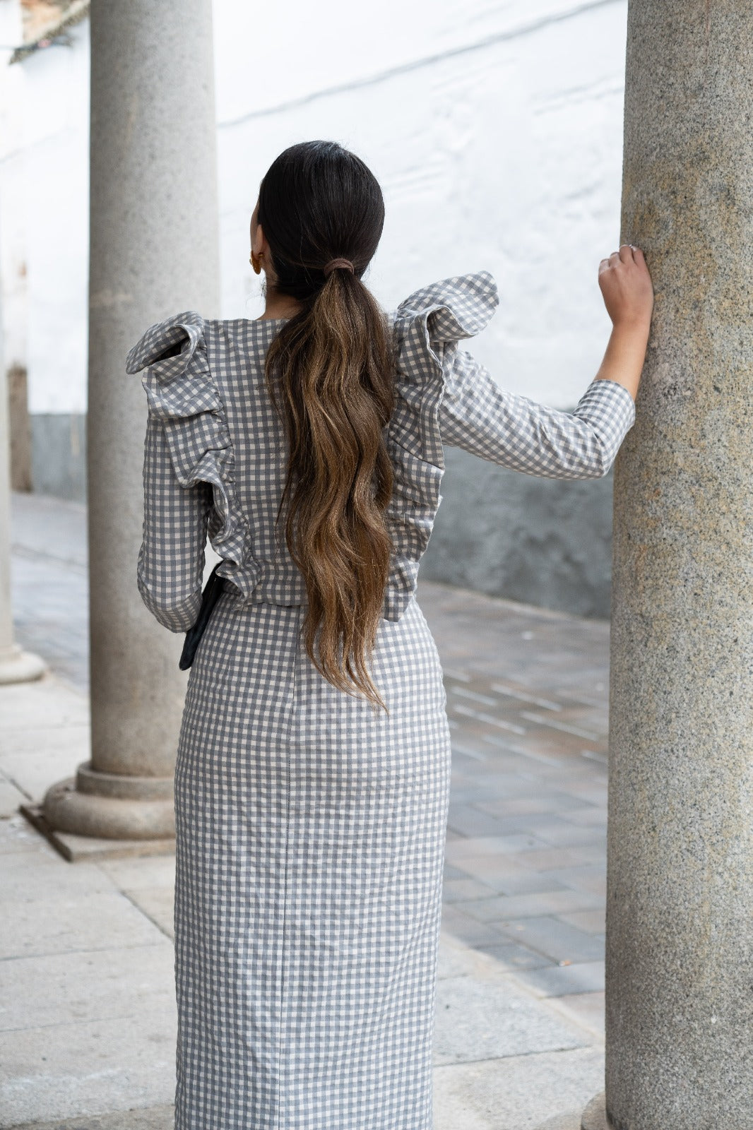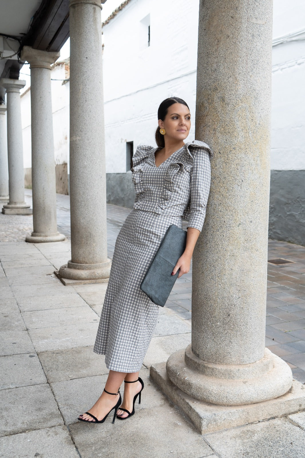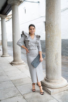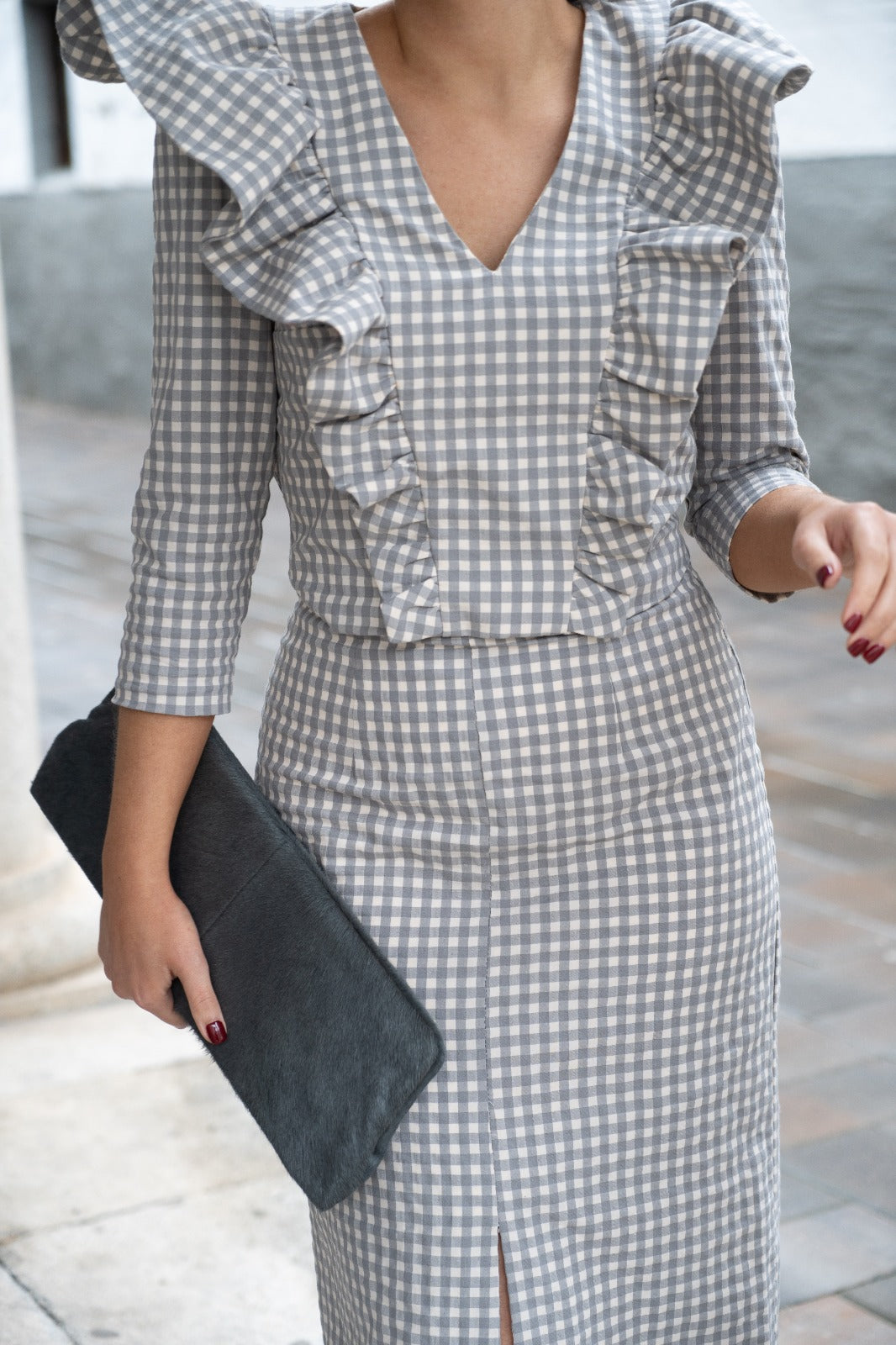 Conjunto composto por blusa com decote em V e babados nas laterais, mangas francesas e saia com cós e fenda frontal. Em xadrez cinza e branco.