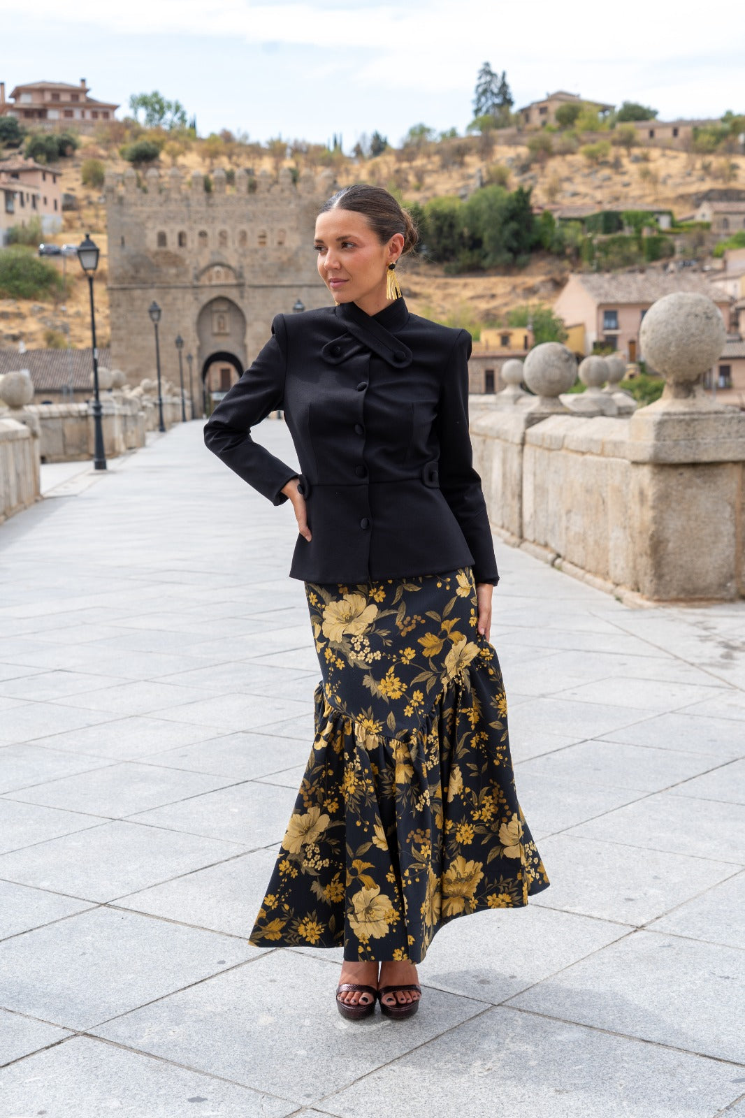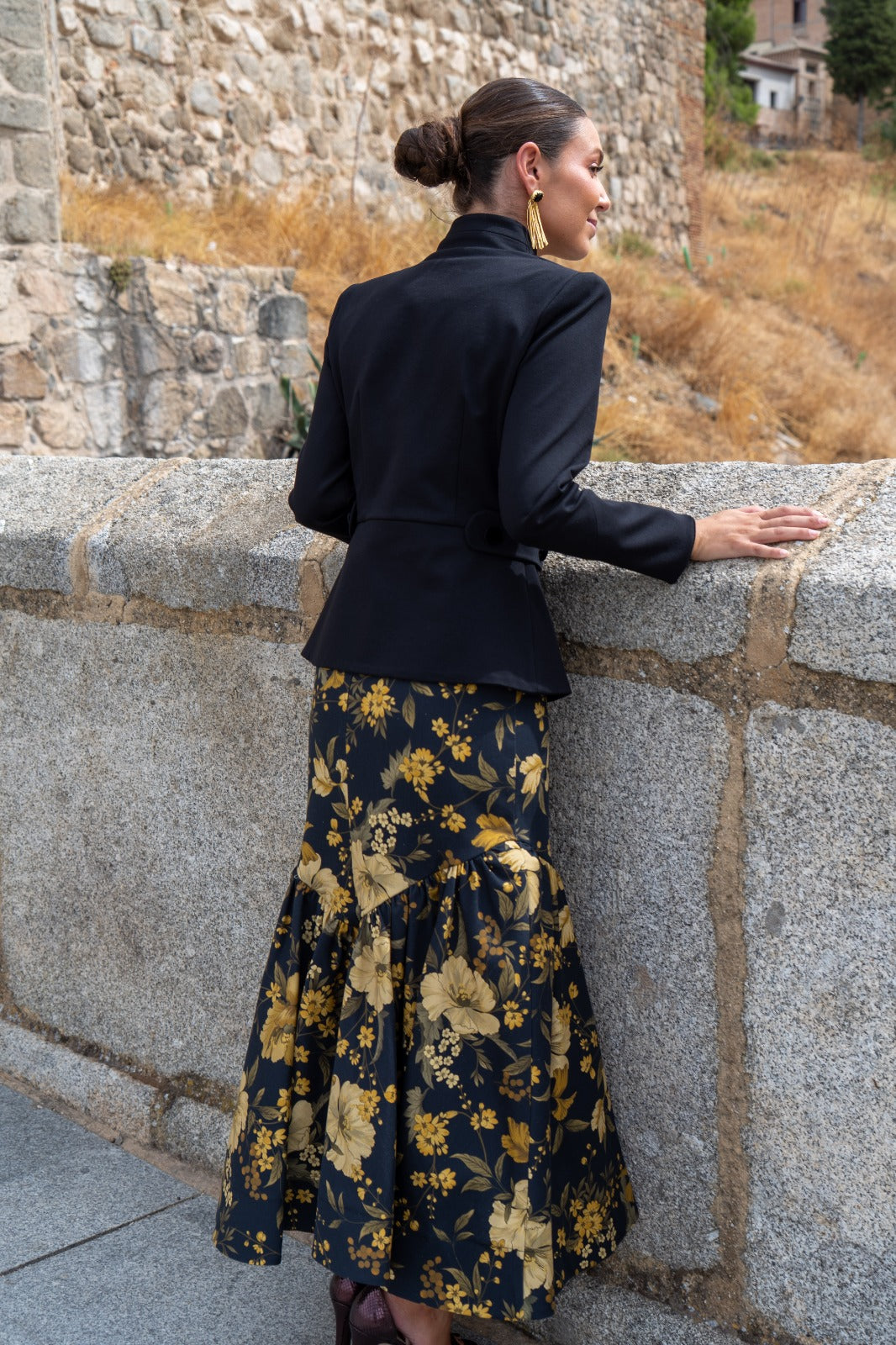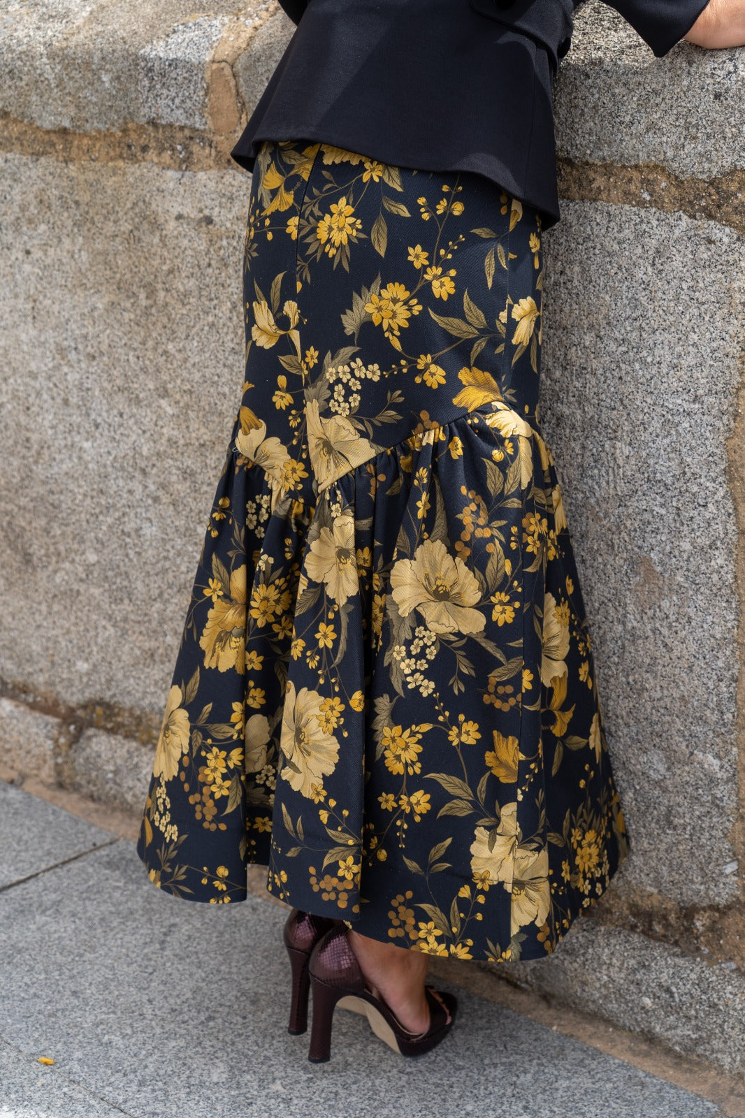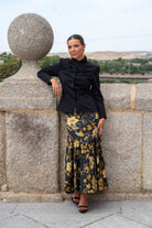 Conjunto composto por um casaco de gola mandarim com abotoamento duplo, manga a três quartos e fecho de botões, e uma saia sereia com folho na base. Nas cores preto e mostarda.