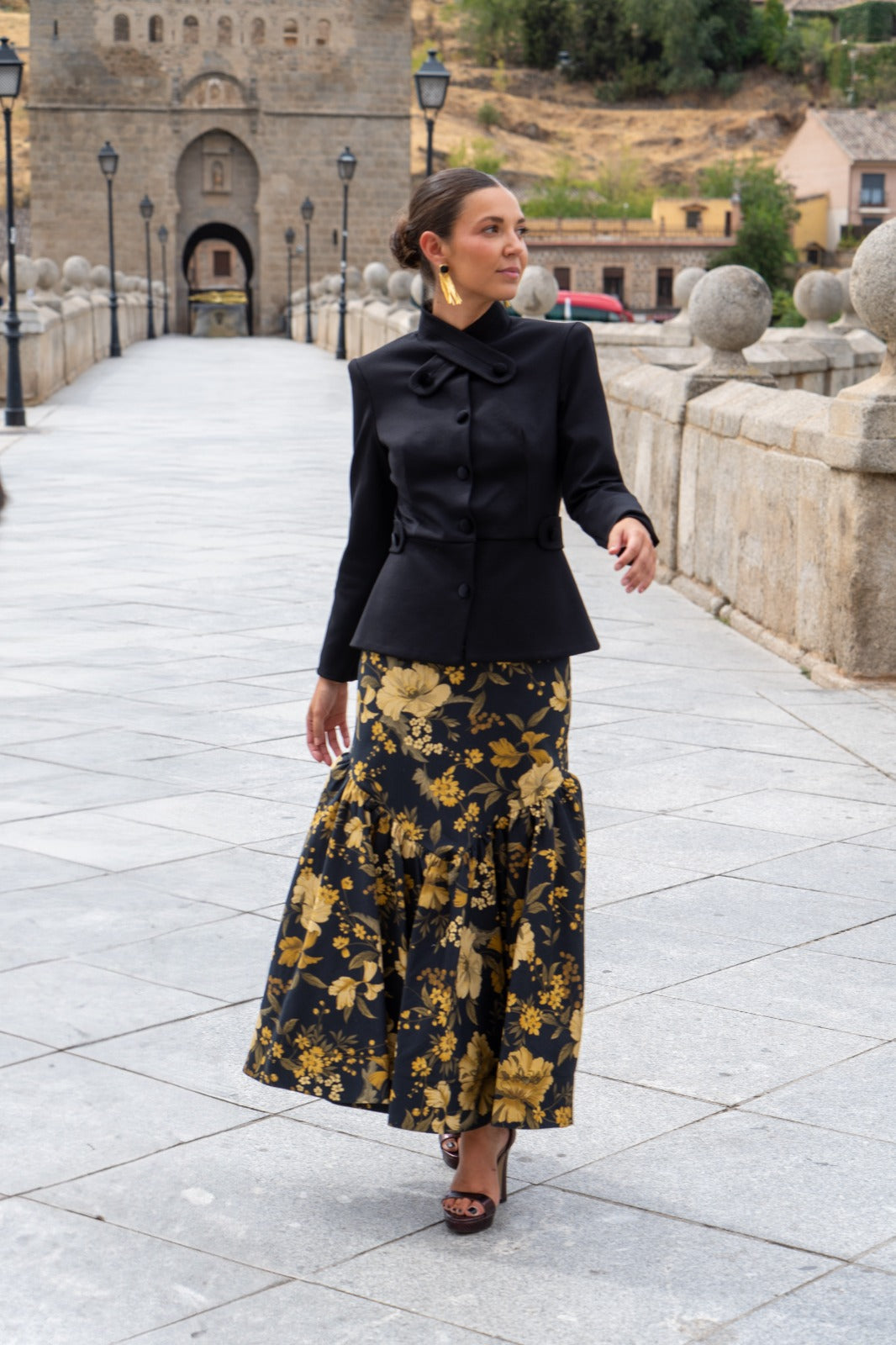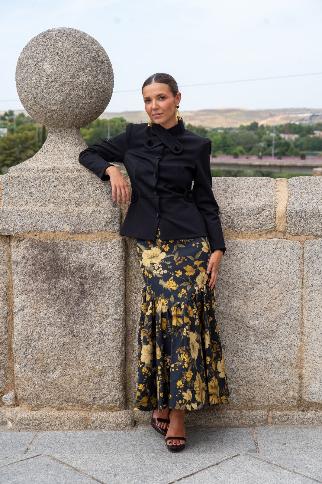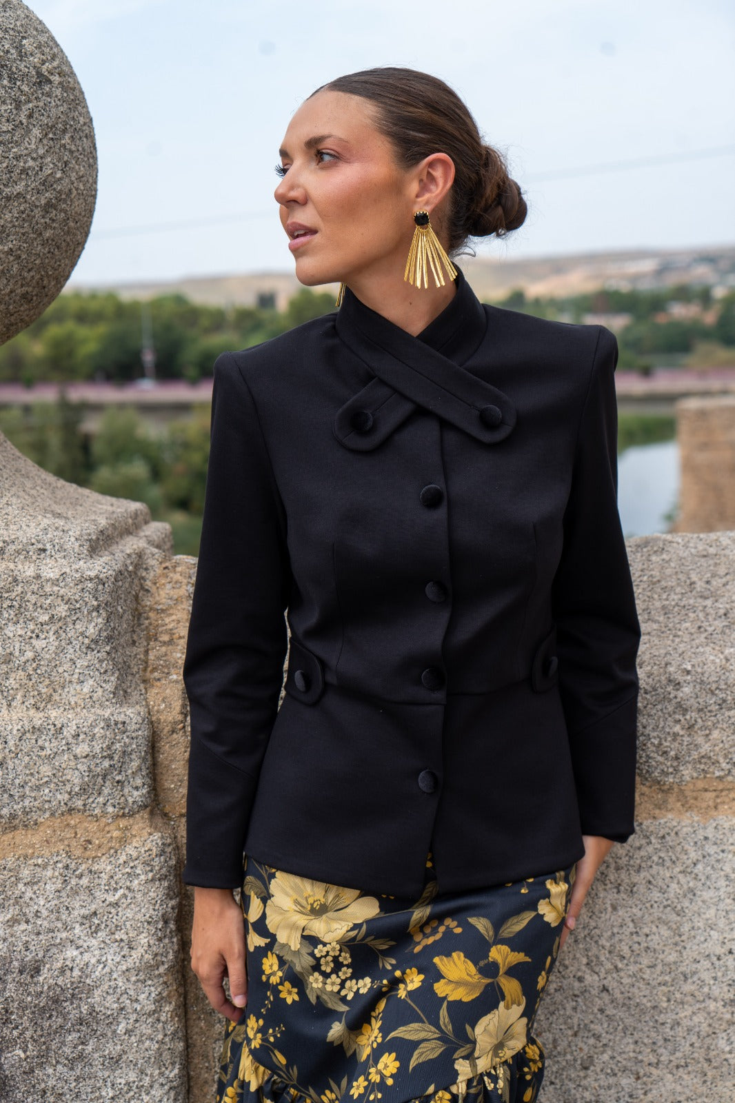 Conjunto composto por um casaco de gola mandarim com abotoamento duplo, manga a três quartos e fecho de botões, e uma saia sereia com folho na base. Nas cores preto e mostarda.