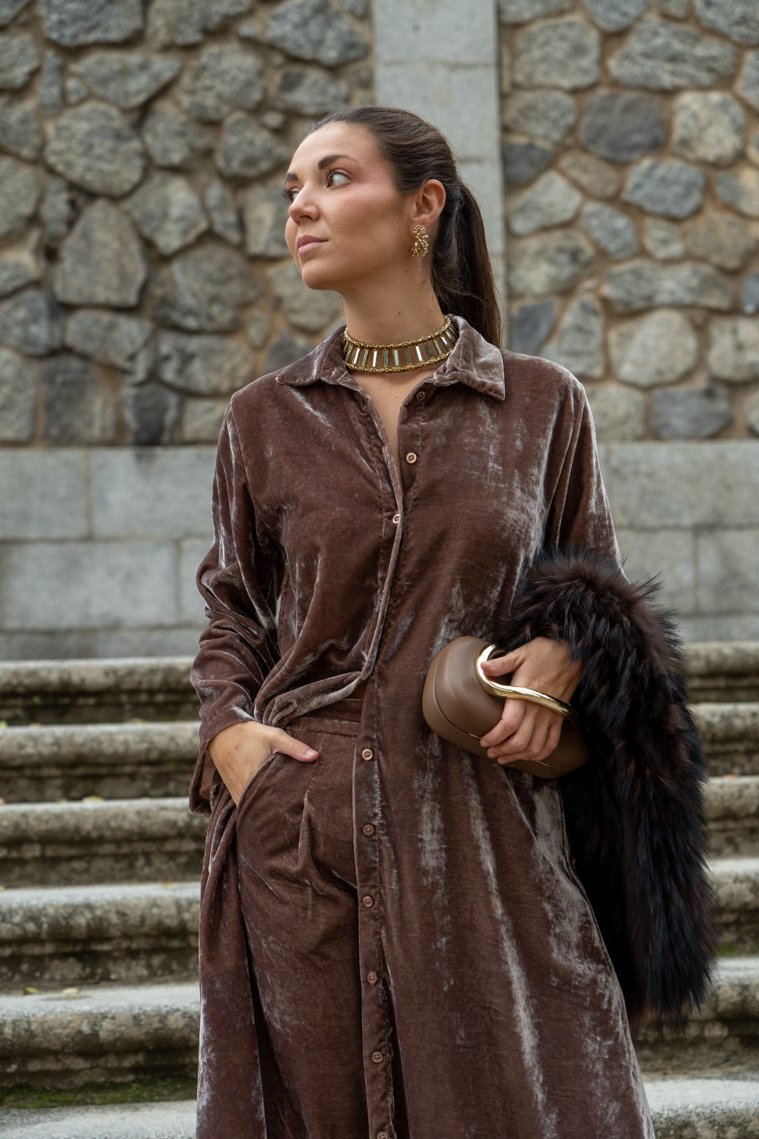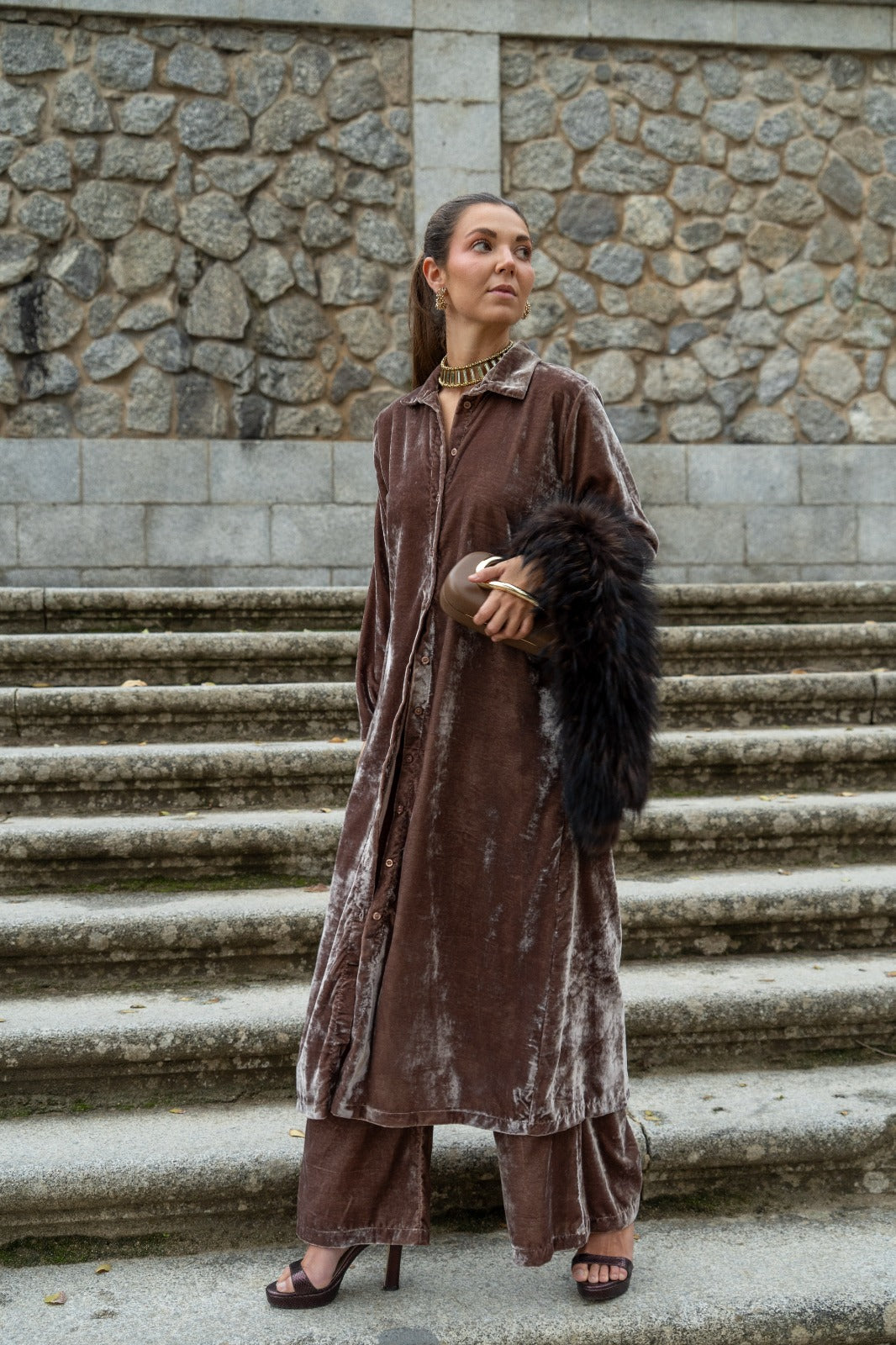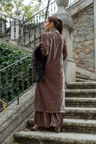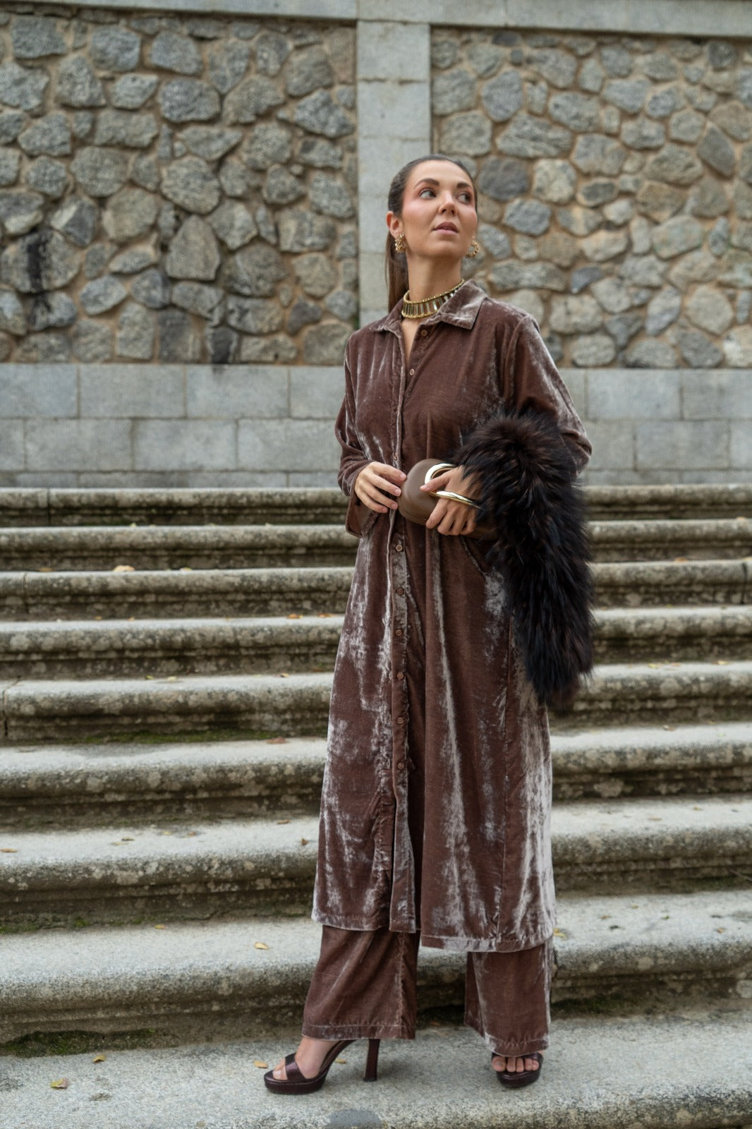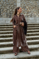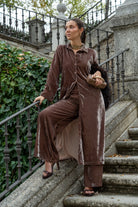Conjunto composto por um caftan de mangas compridas com botões e calças com cintura elástica e bolsos laterais. Na cor taupe.