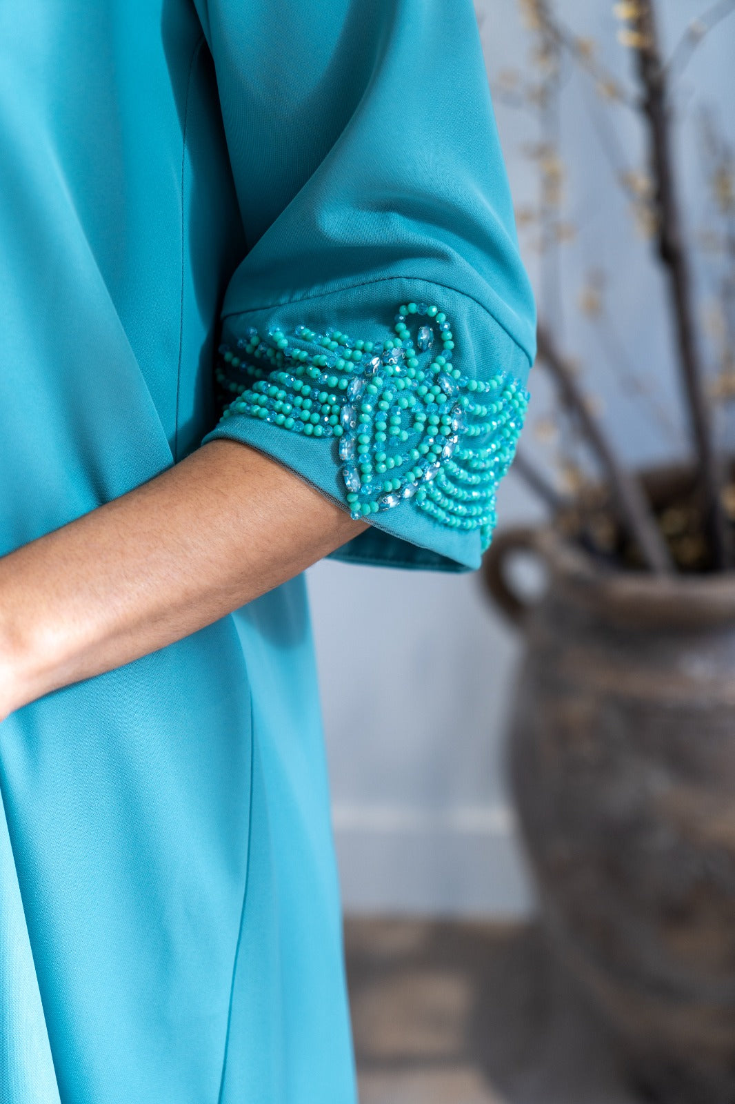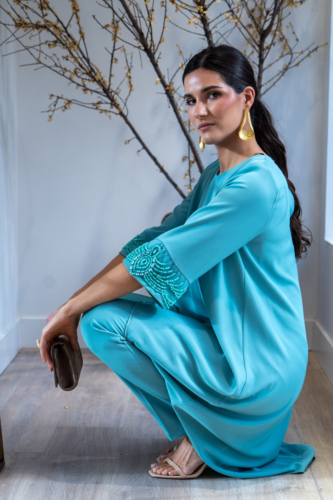 Conjunto compuesto por casaca asimétrica, escote redondo, manga francesa con detalle pedrería en el puño y pantalón con cintura, estrecho de abajo. En color azul.
