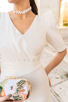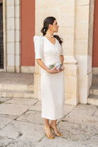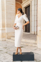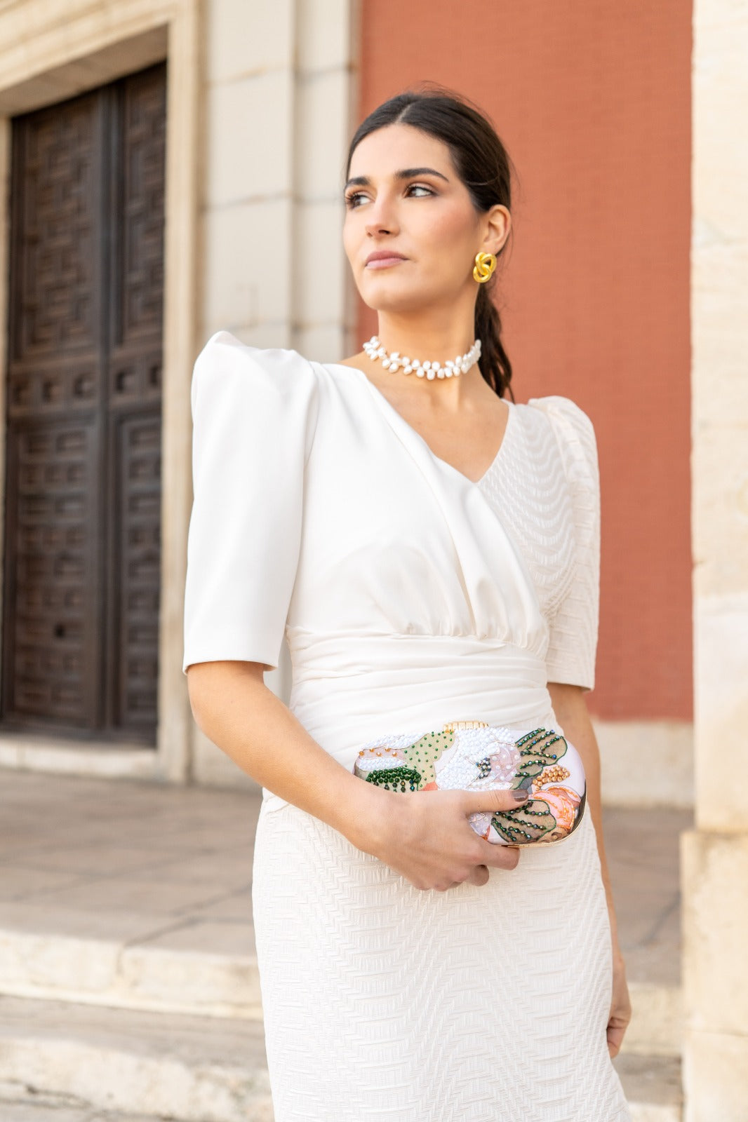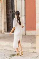 Vestido midi, escote a pico, manga corta y abullonada, combinación de tejidos con corte en cintura. En color beige con lurex dorado.