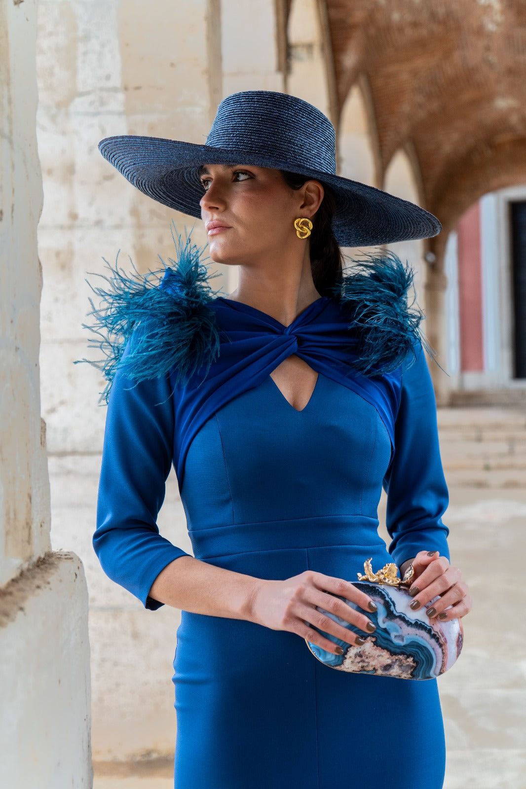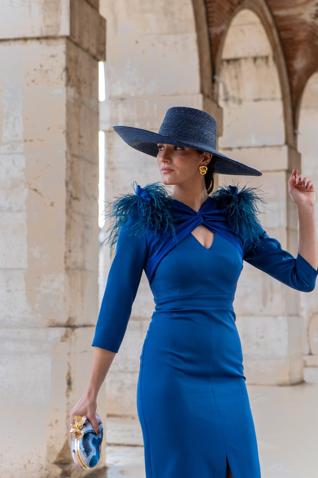 Vestido midi, manga francesa, escote con nudo y lagrima, detalle plumas en hombros, abertura delantera. En color azul.