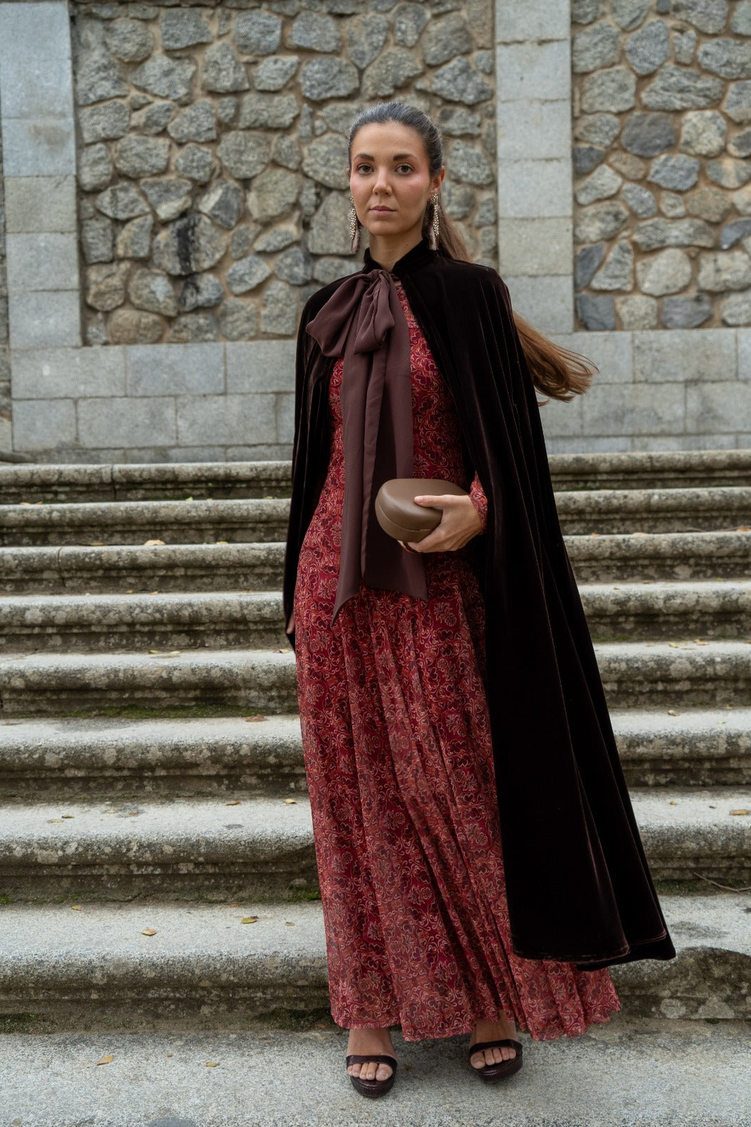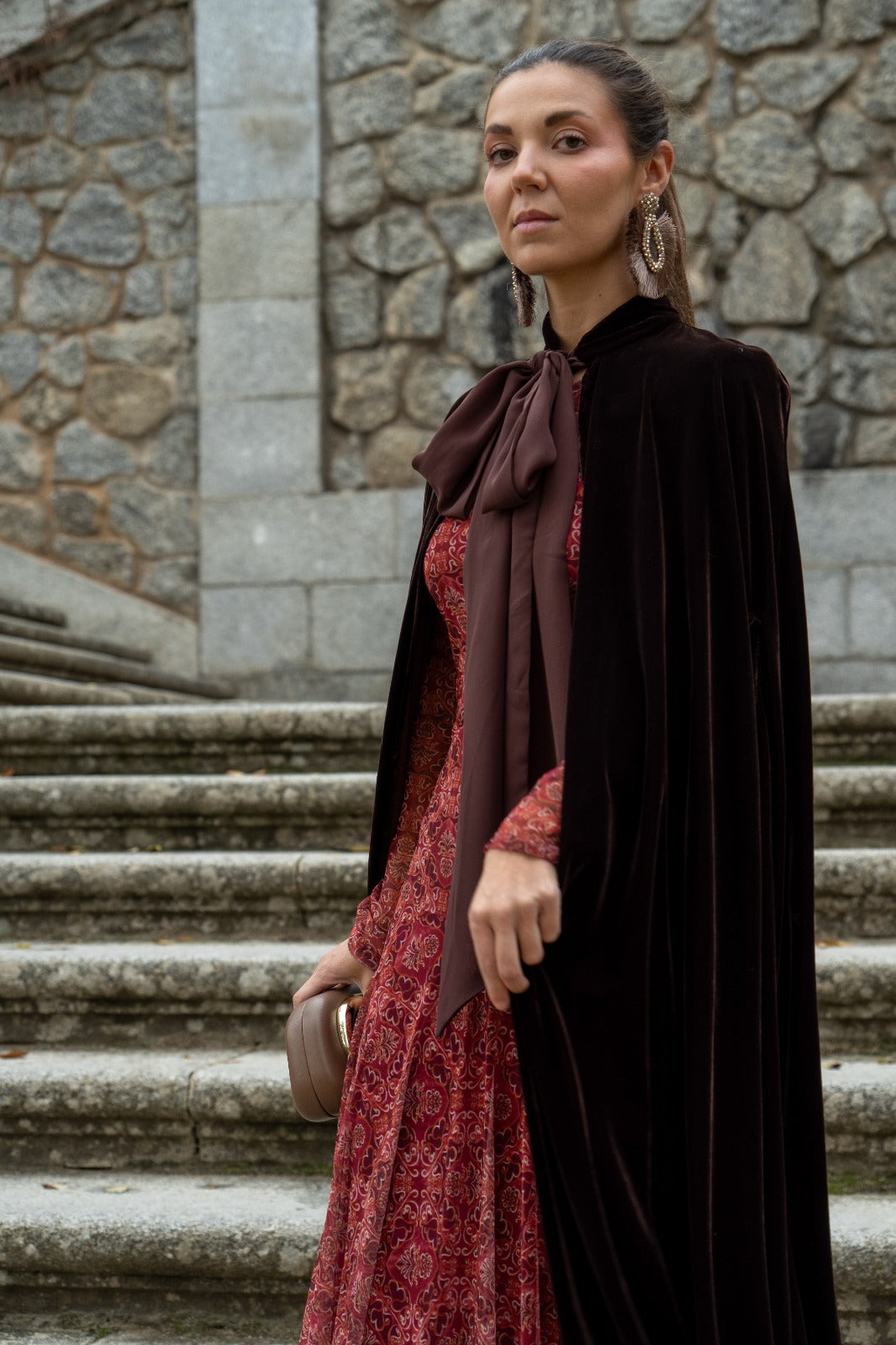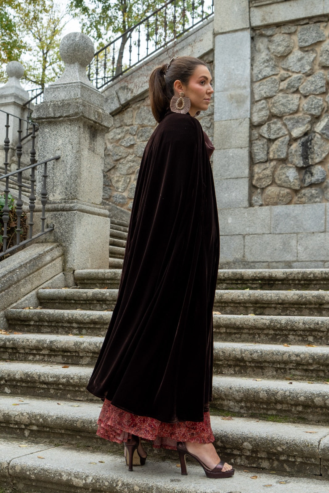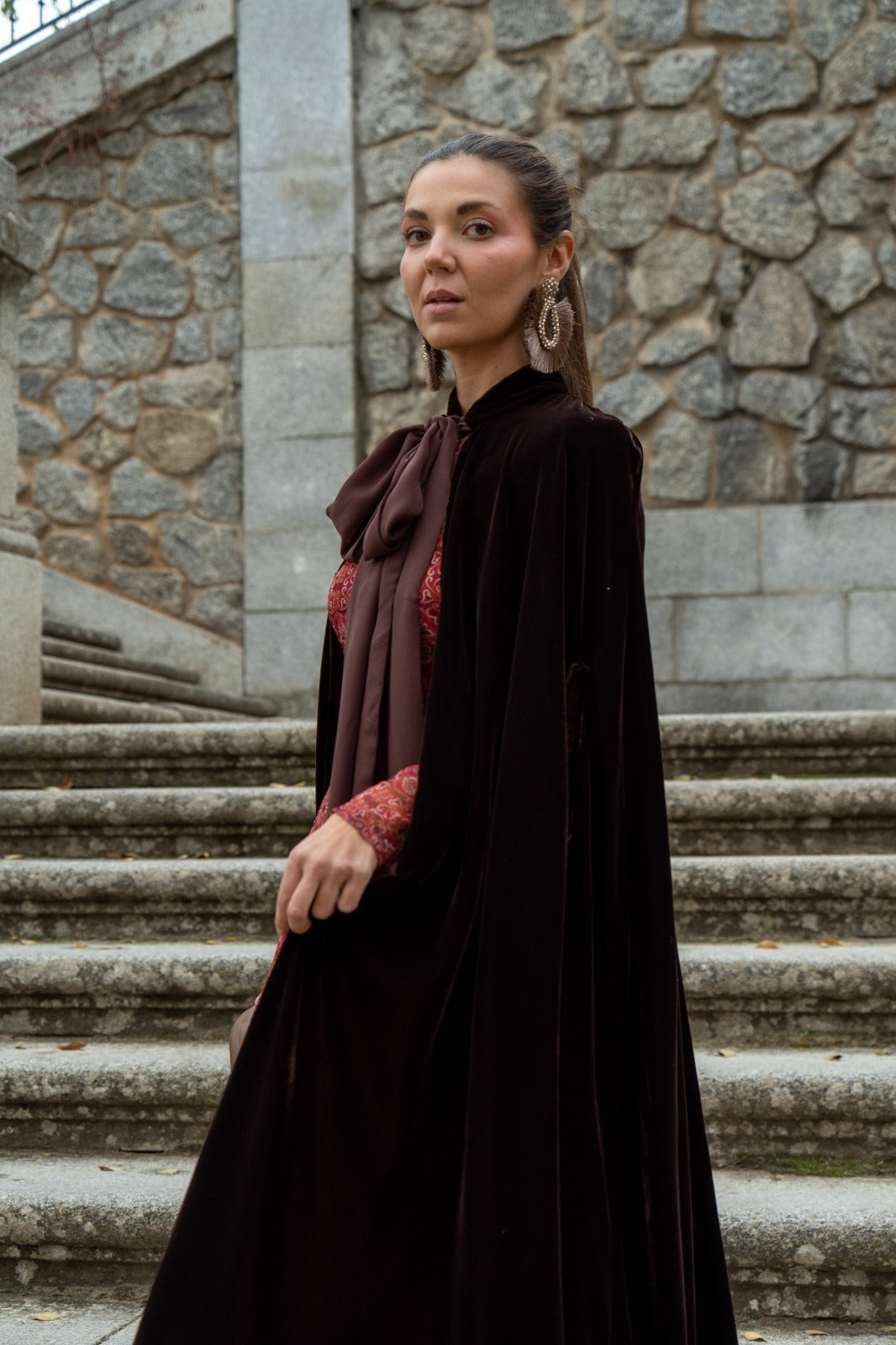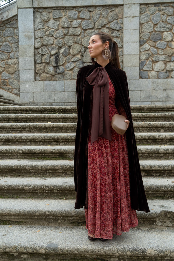 Capa em veludo, com aberturas para as mãos, com aproximadamente 122 cm de comprimento, com laço para fechar no pescoço. Na cor castanha.