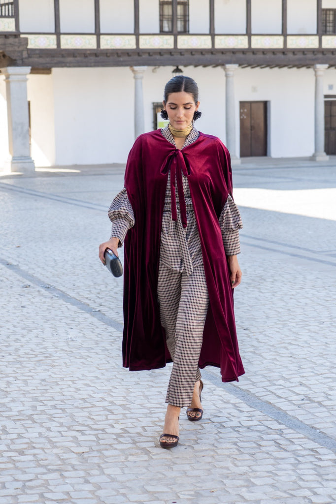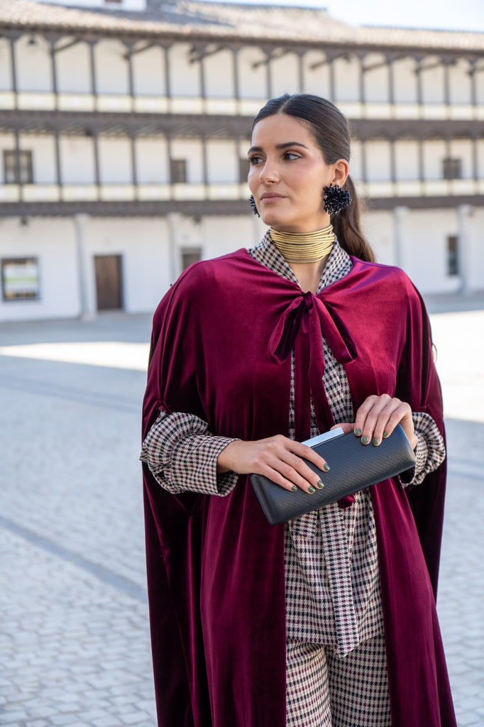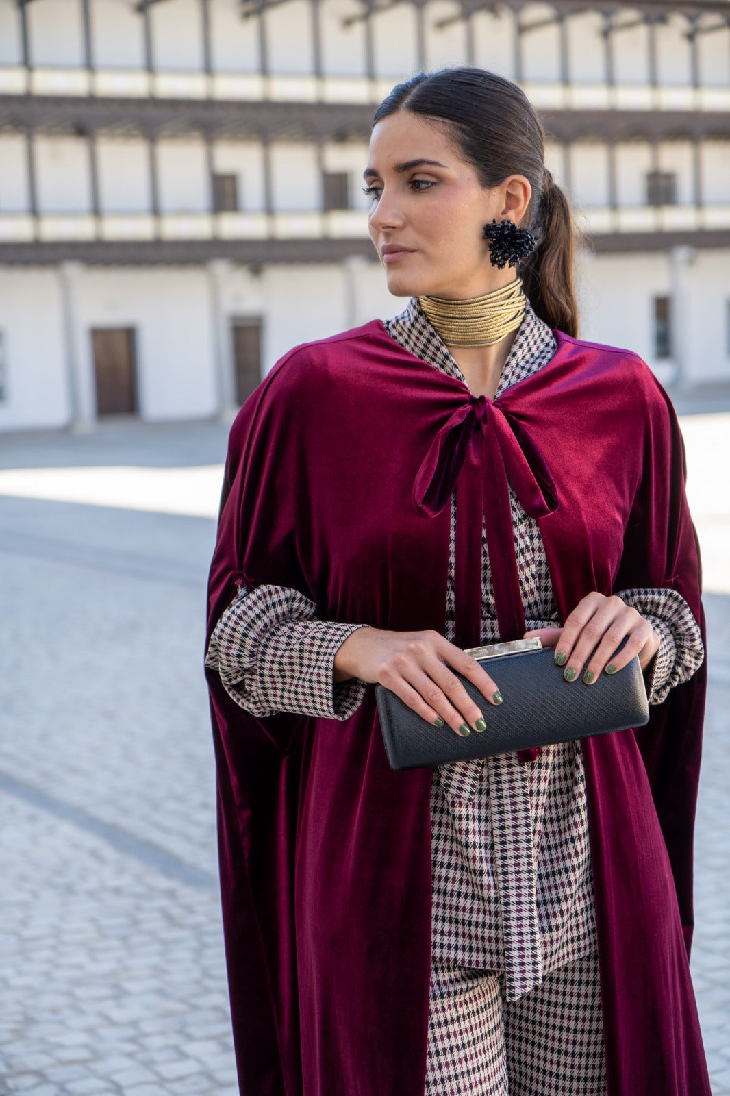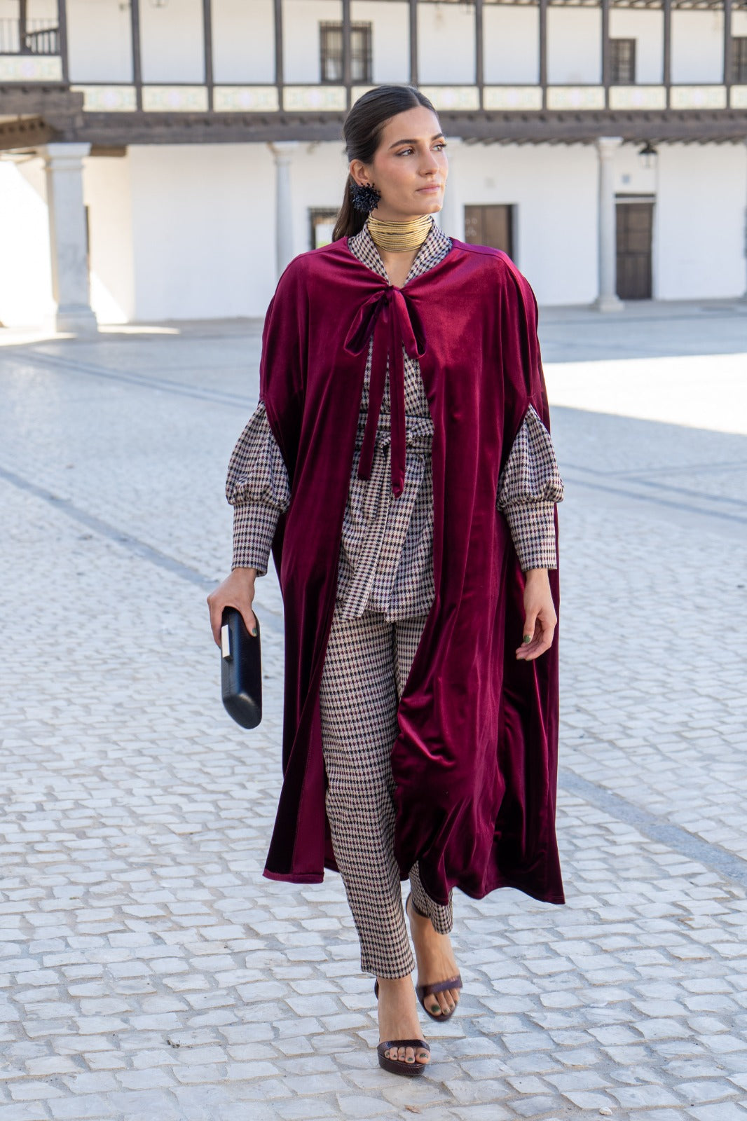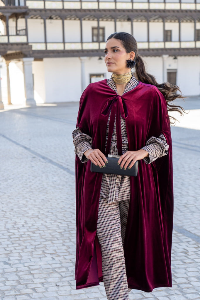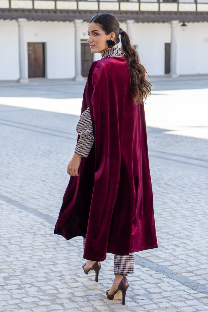 Capa em veludo, com aberturas para as mãos, com aproximadamente 120 cm de comprimento, com laço para fechar no pescoço. Na cor bordeaux.