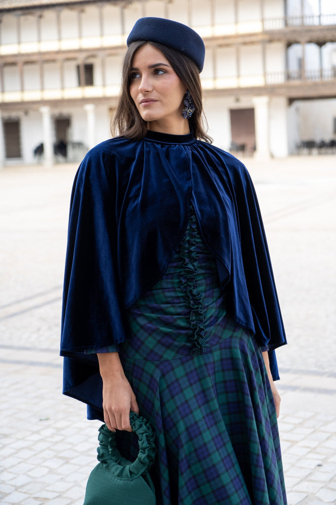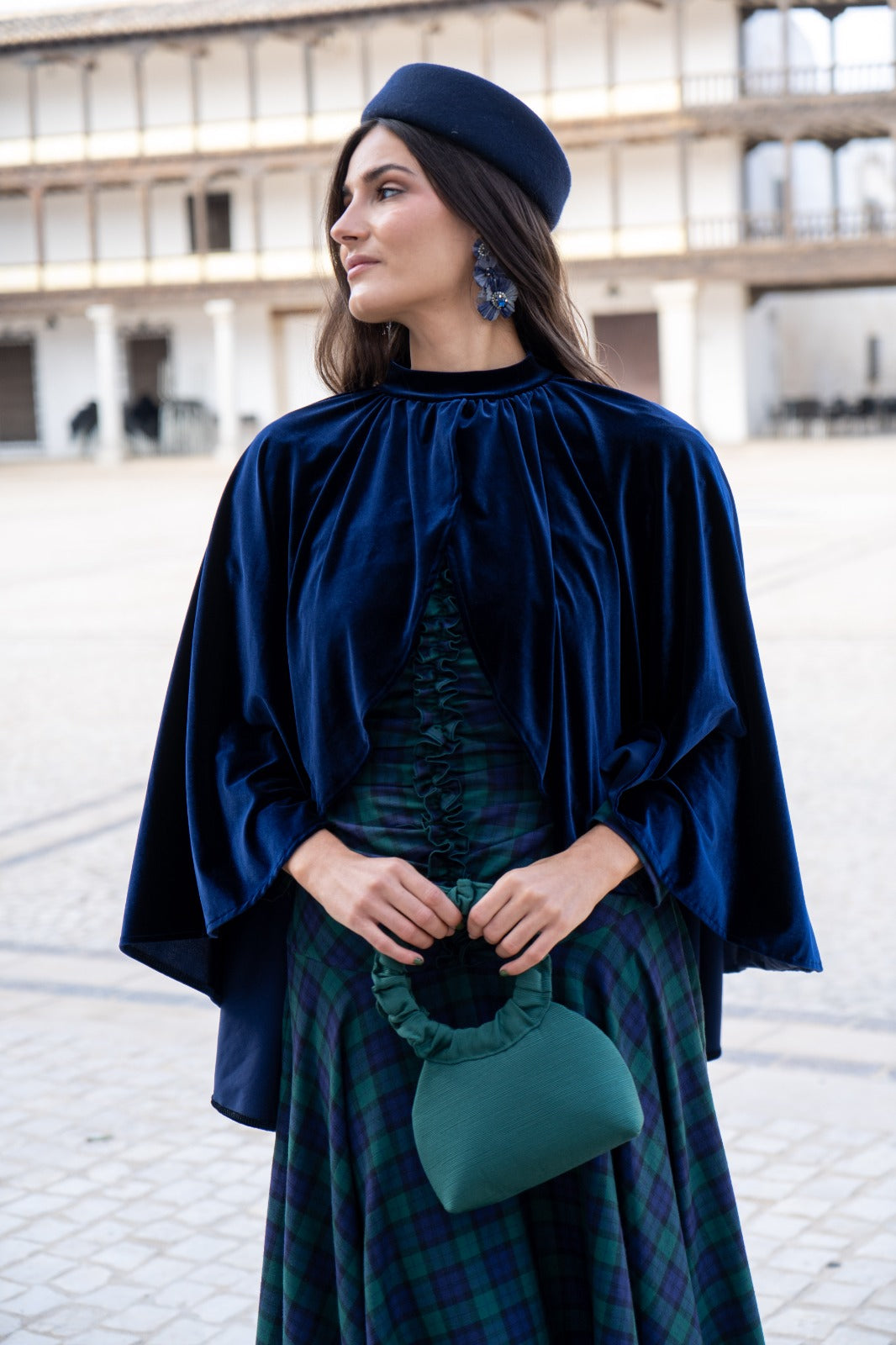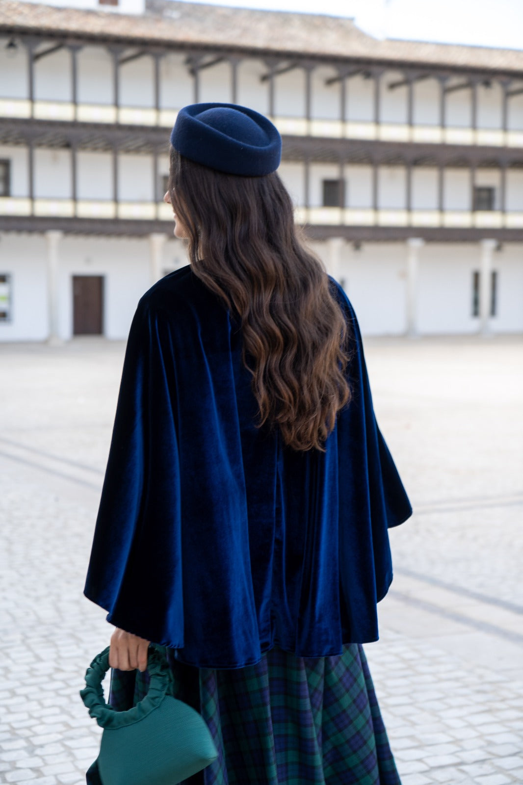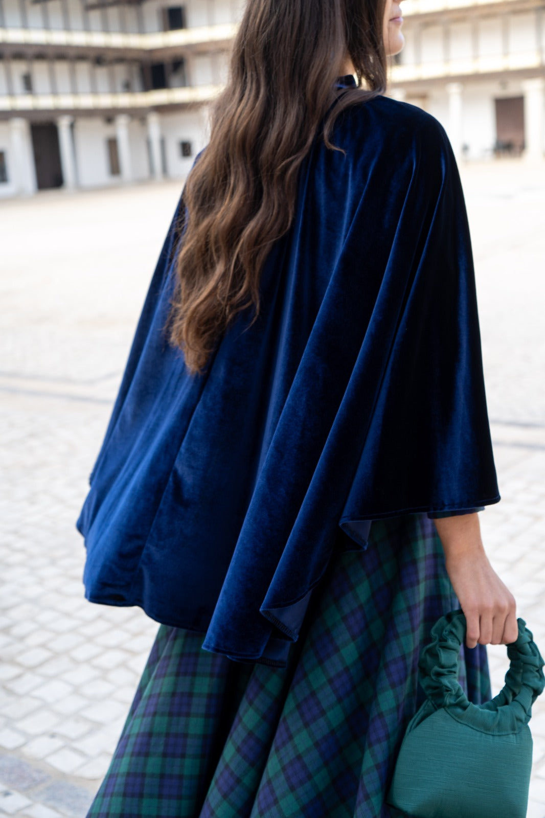 Capa curta em veludo, com gola alta, aberta à frente e fechada atrás com dois botões. Na cor azul.