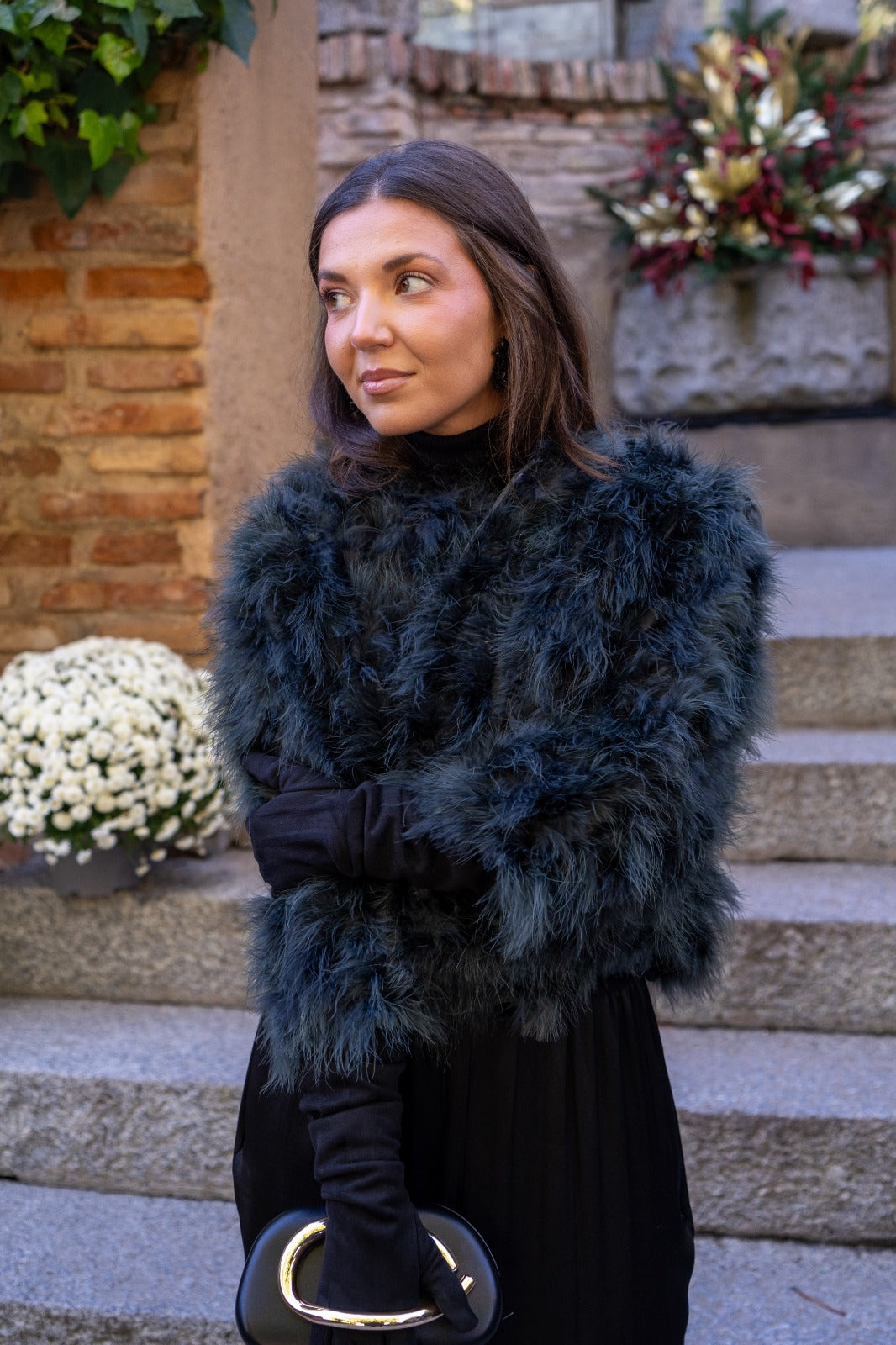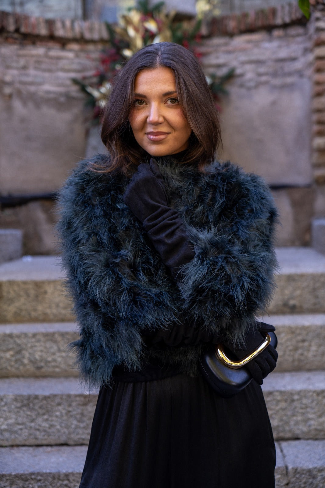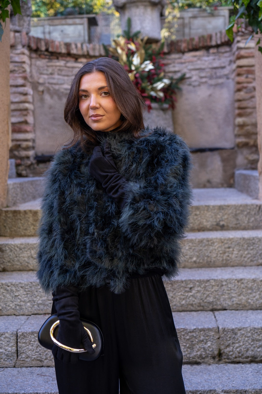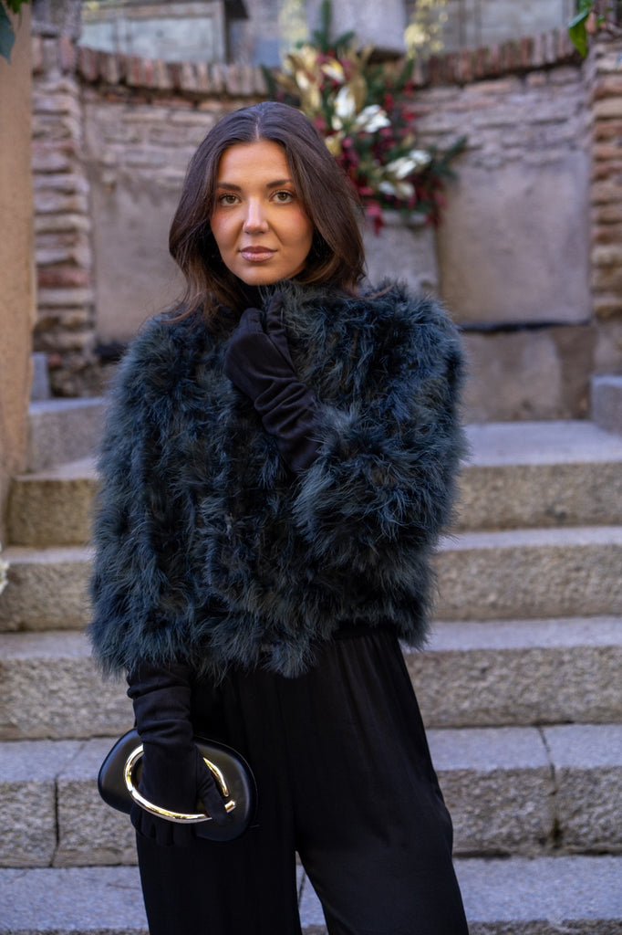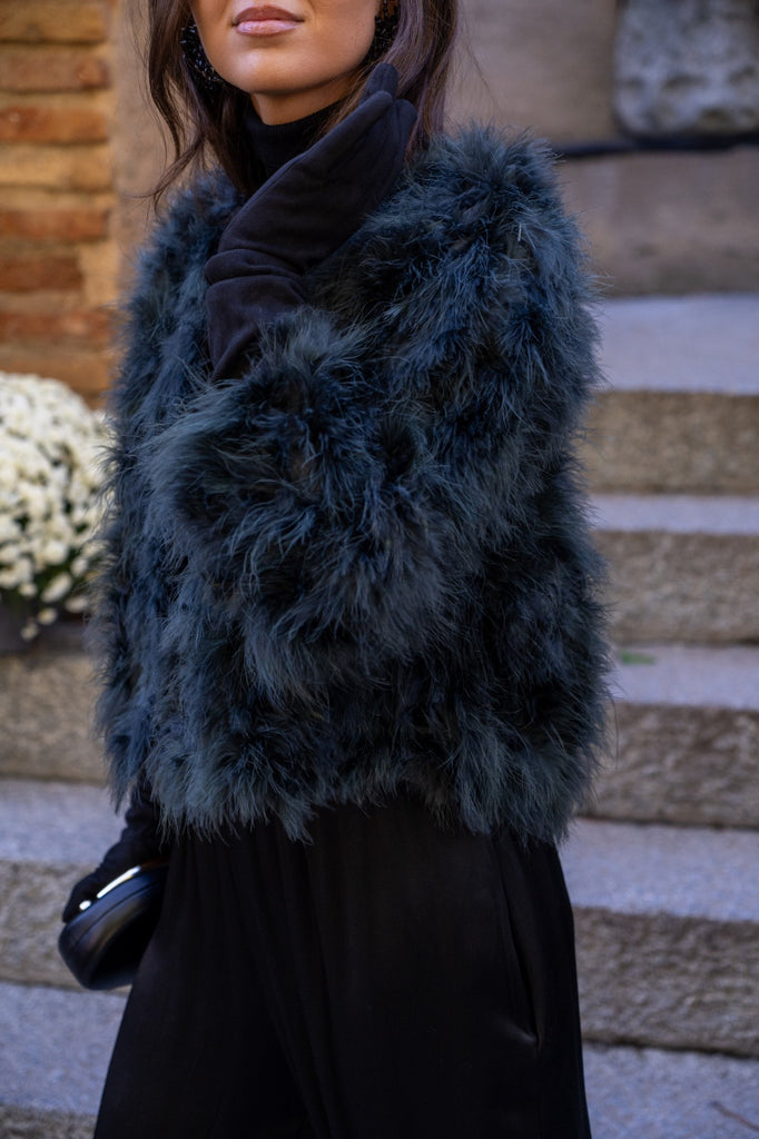 Chaqueta corta, cuello redondo, bolsillos laterales, en marabú color verde.