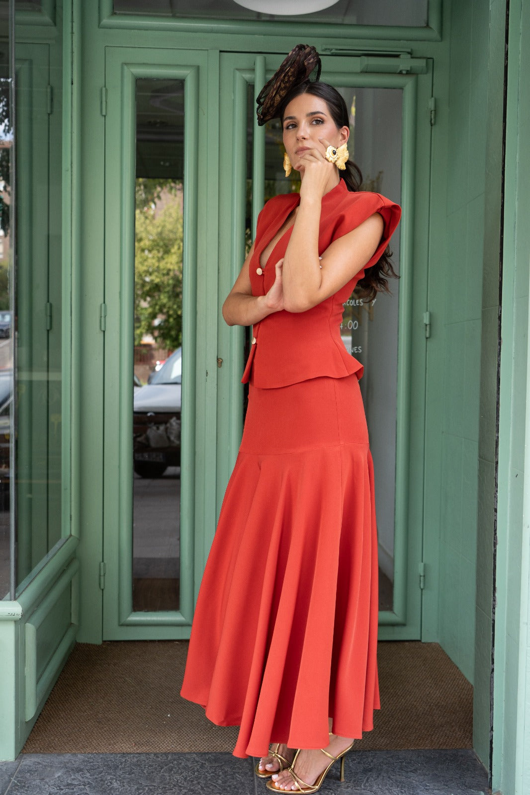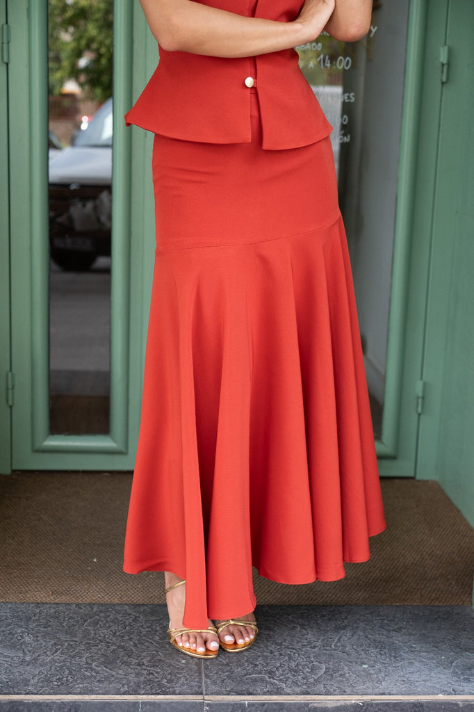 Conjunto composto por um colete de ombros altos com abotoamento frontal e uma saia midi evasé. Na cor ferrugem.