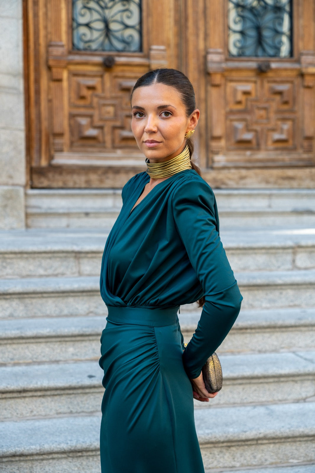 Conjunto composto por um body com decote cruzado, manga comprida, ombros estruturados e saia direita drapeada com cós. Na cor verde.