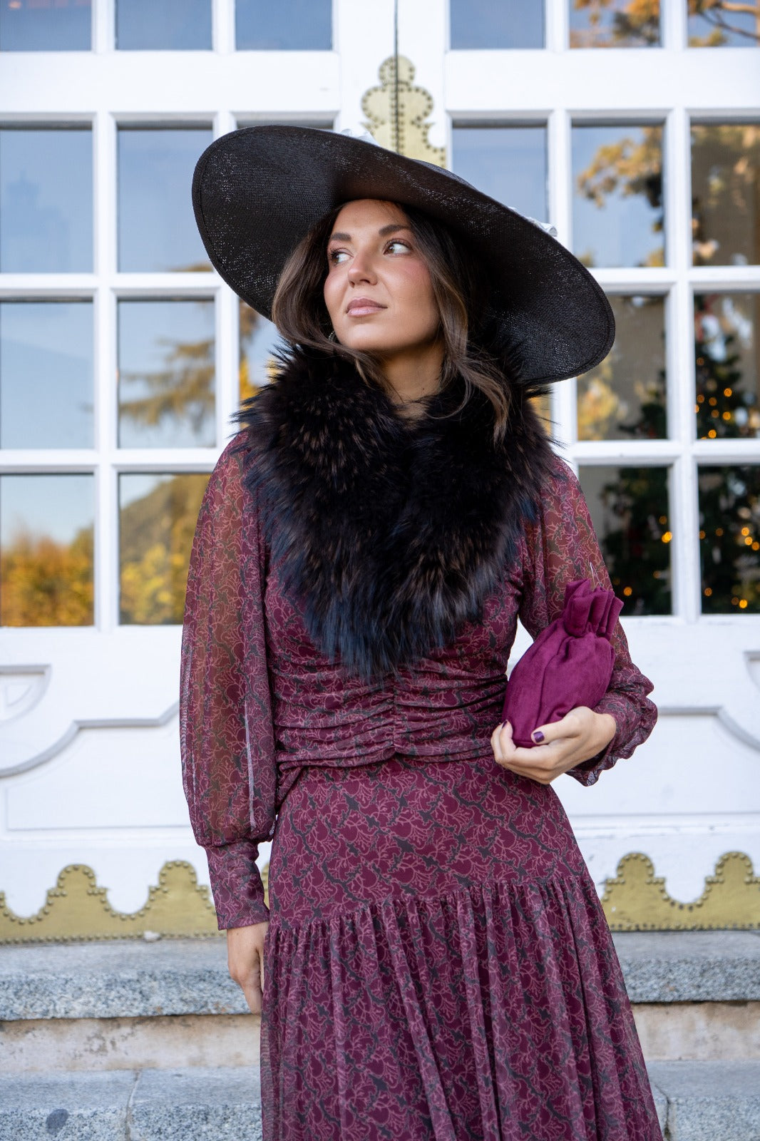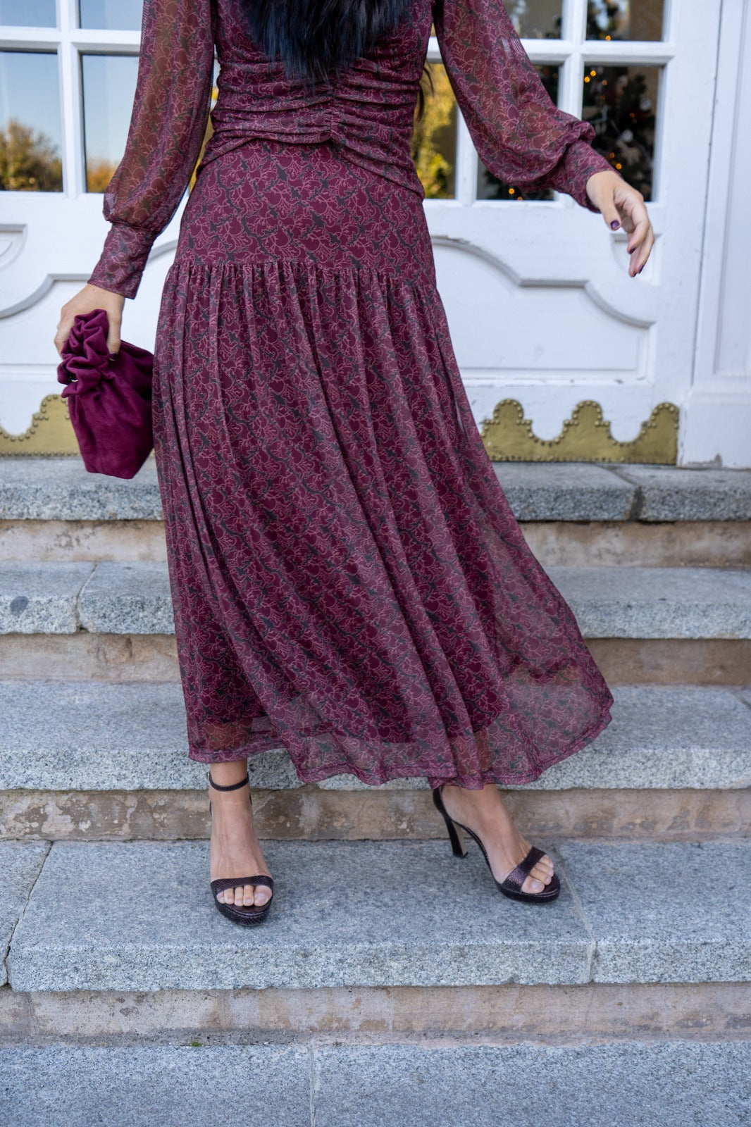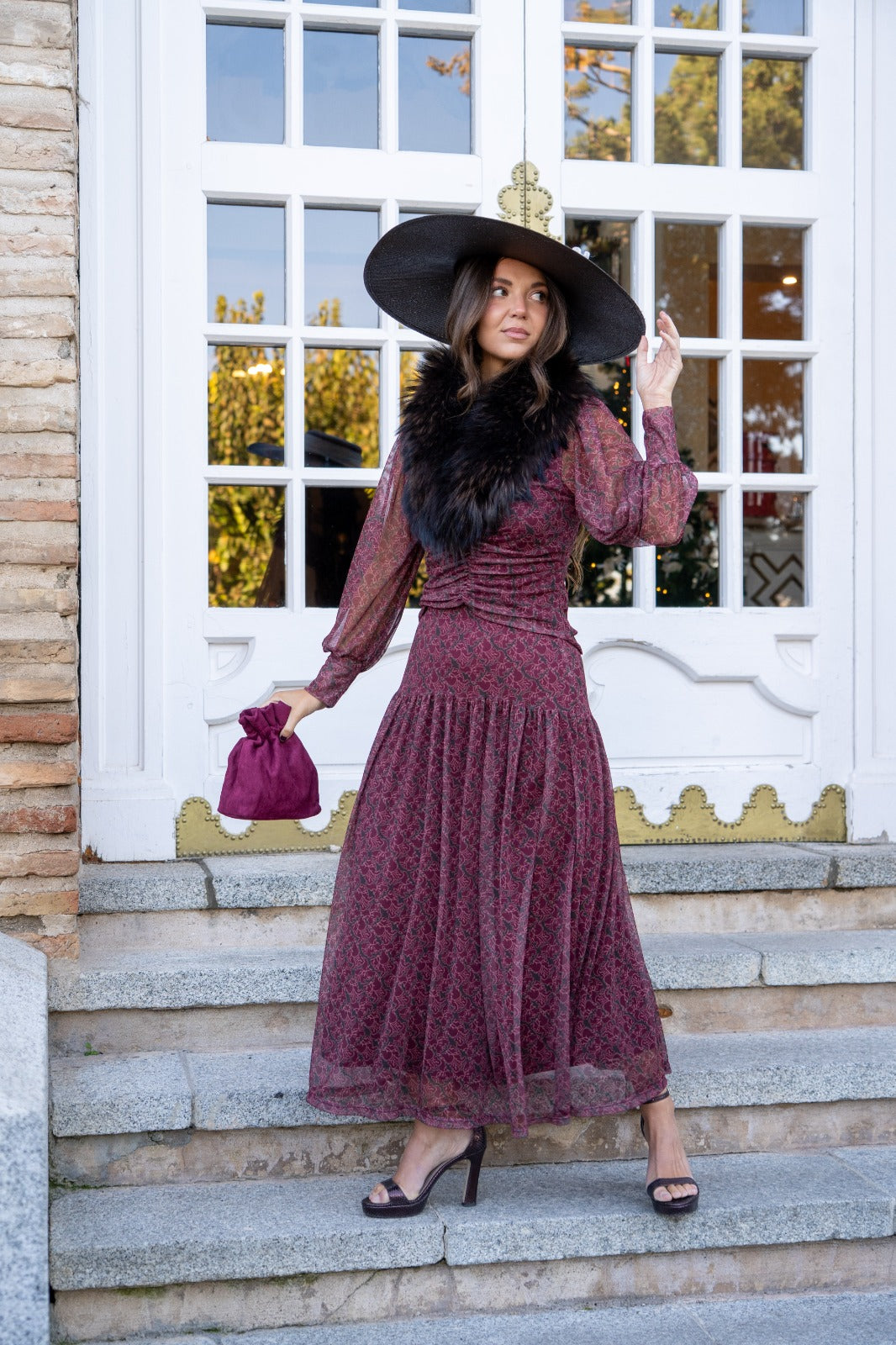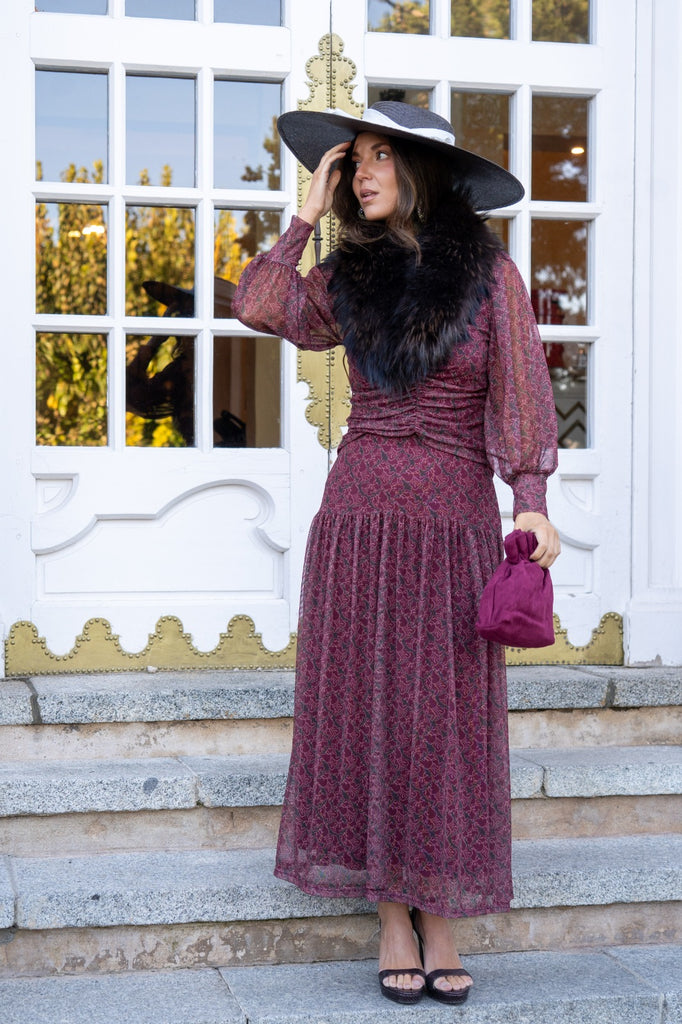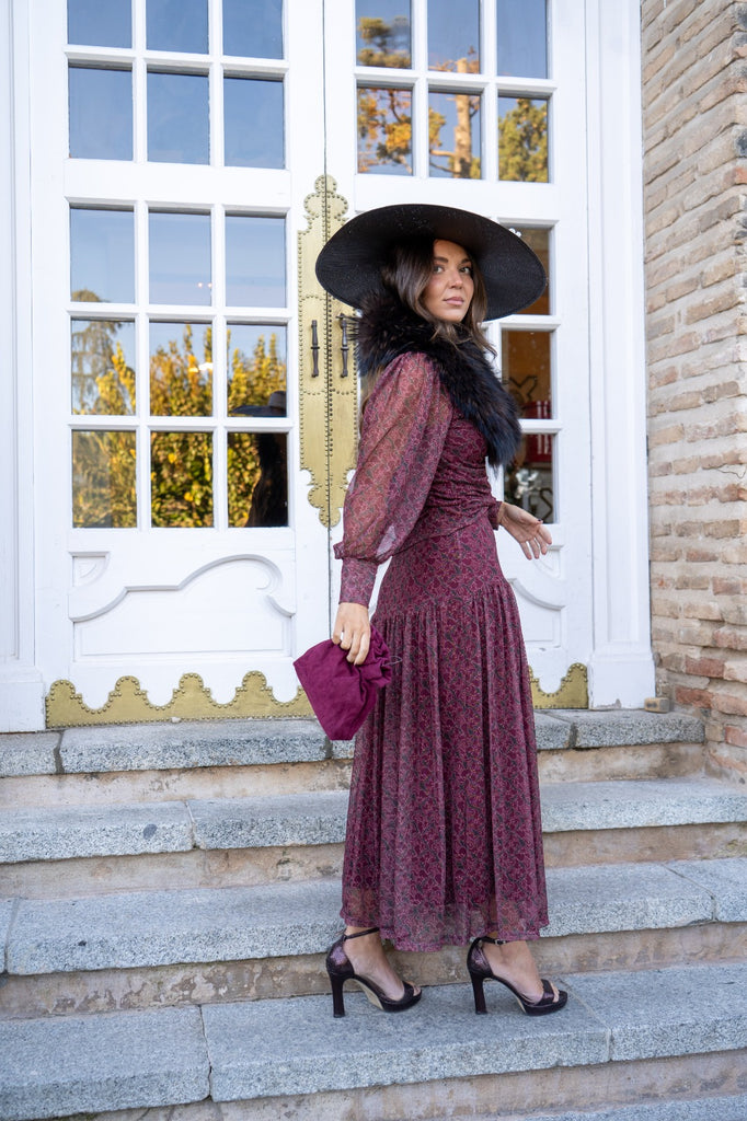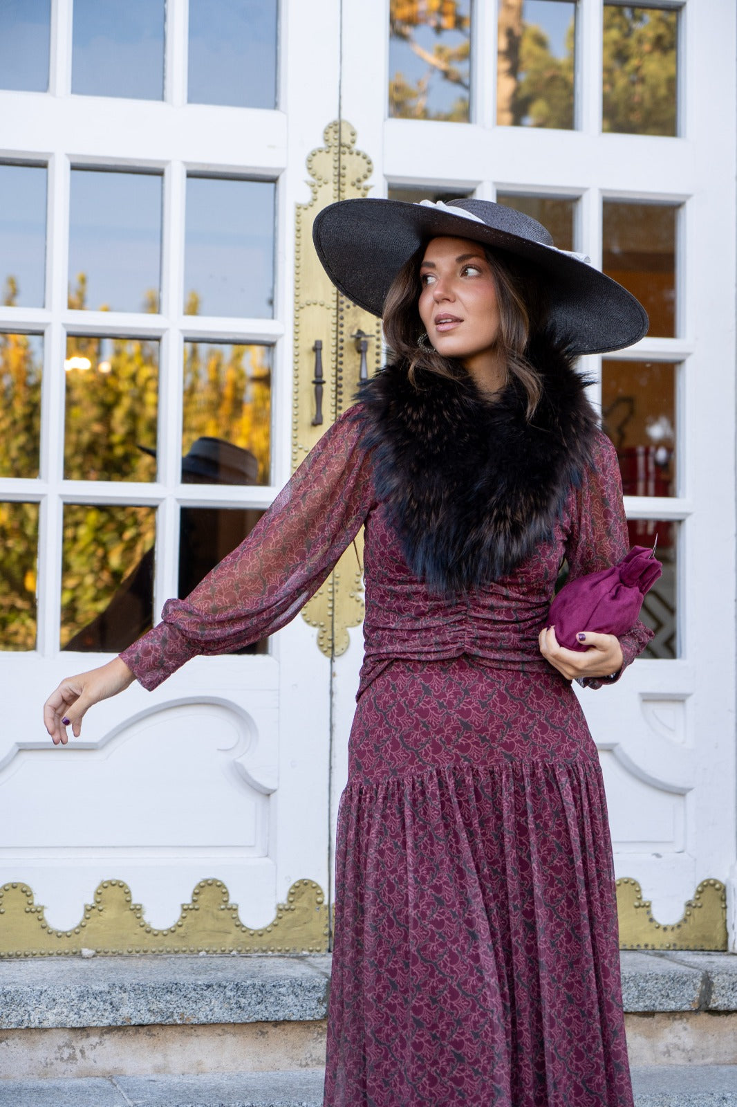Conjunto compuesto por top escote a pico subido, fruncido delantero y falda cintura engomada, plisada. En color burdeos con estampado.