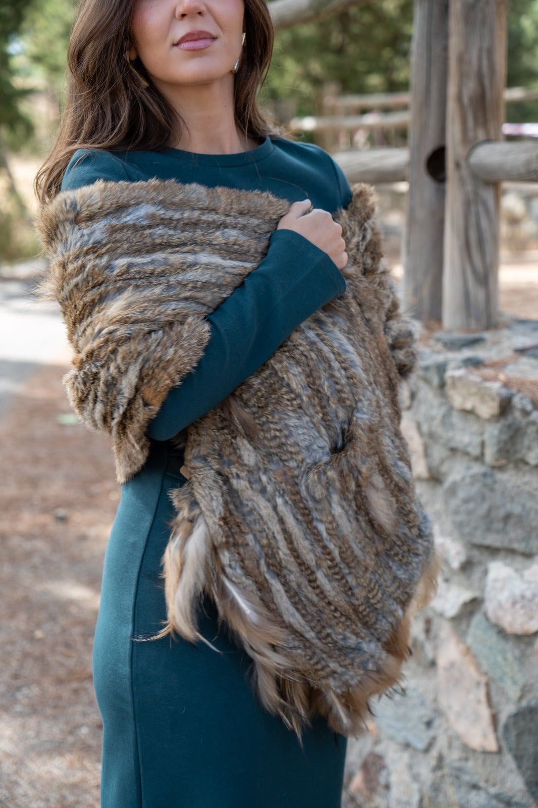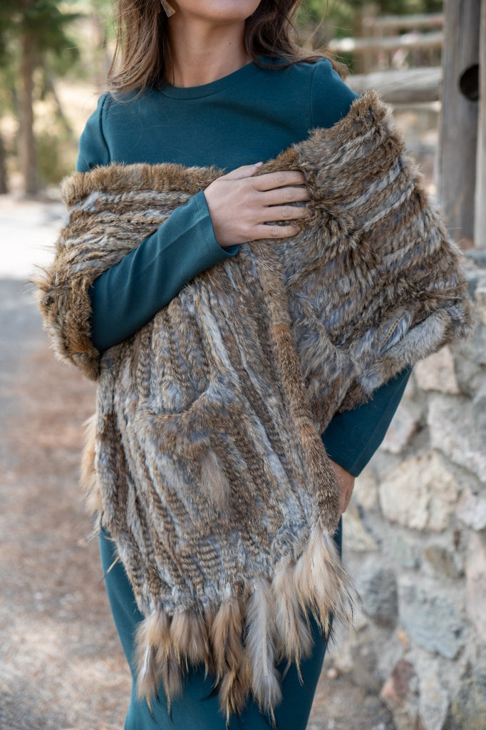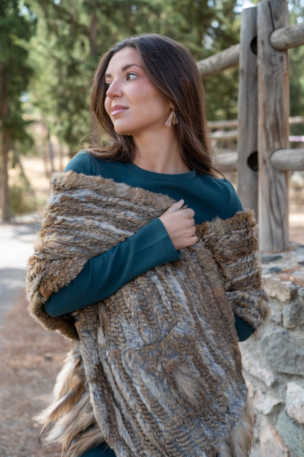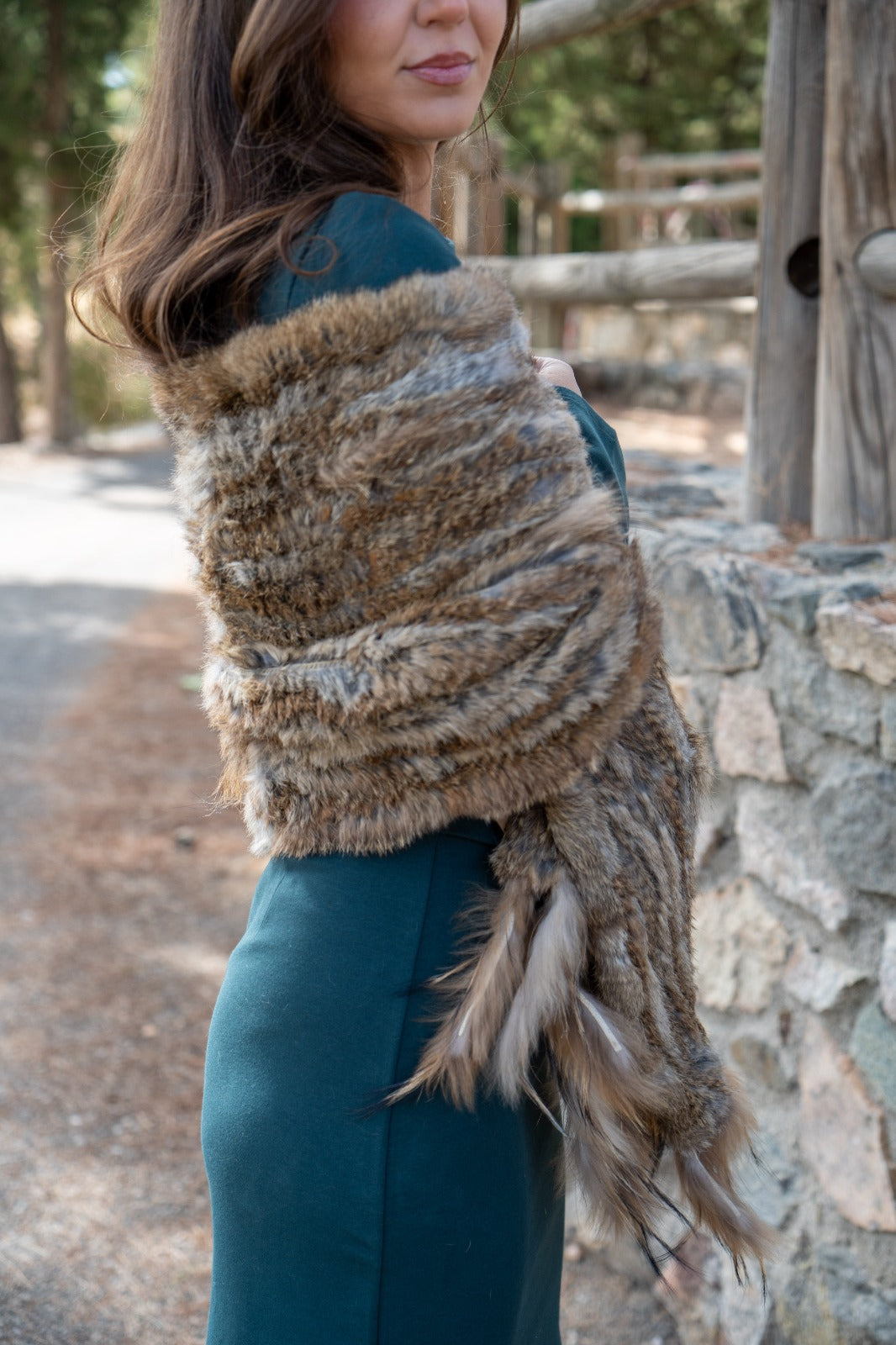 Estola em pele com franjas nas extremidades, multicolorida em tons de castanho.