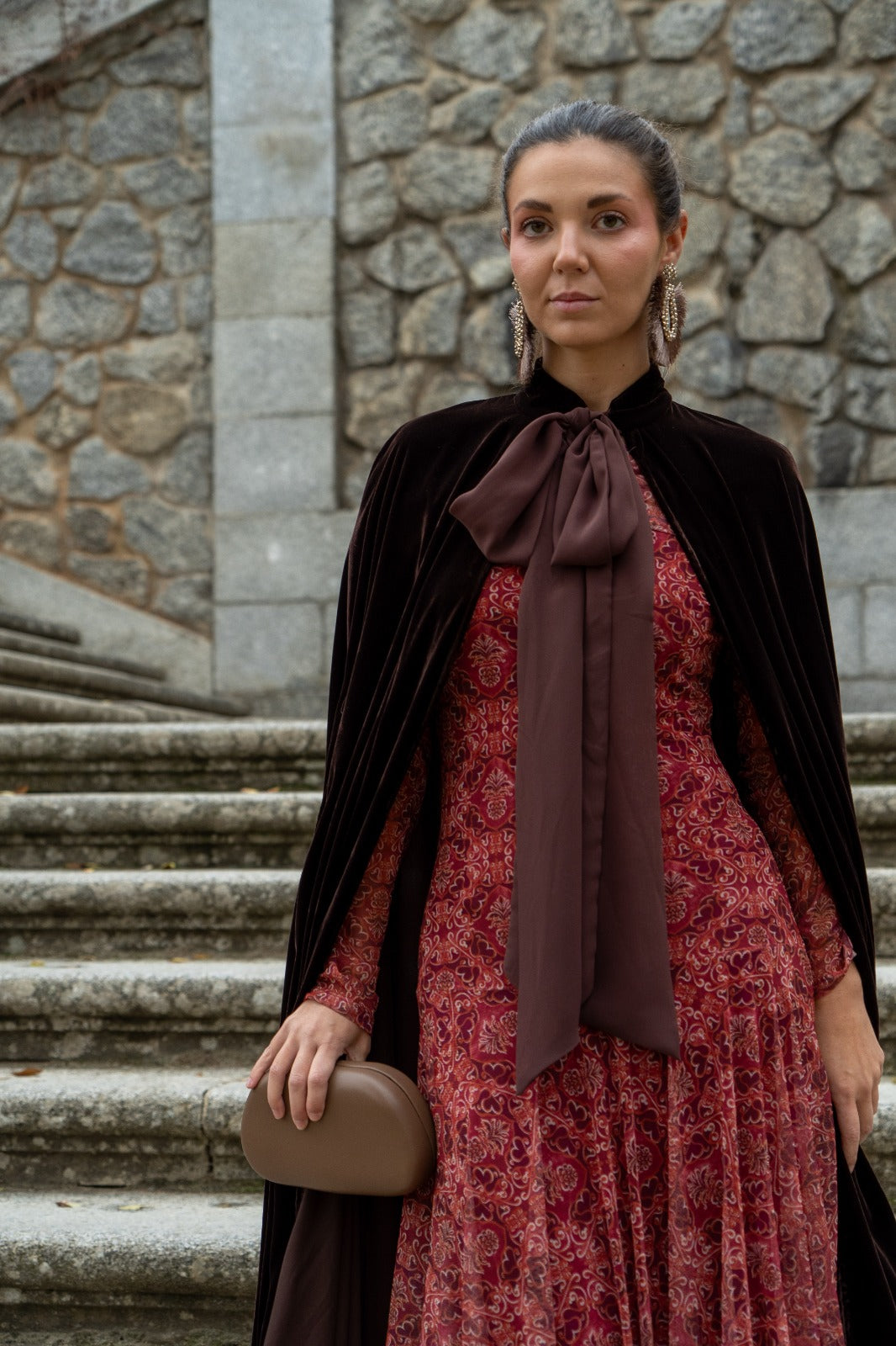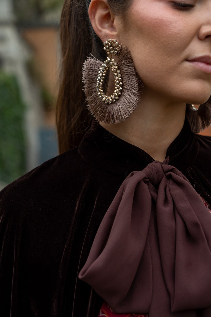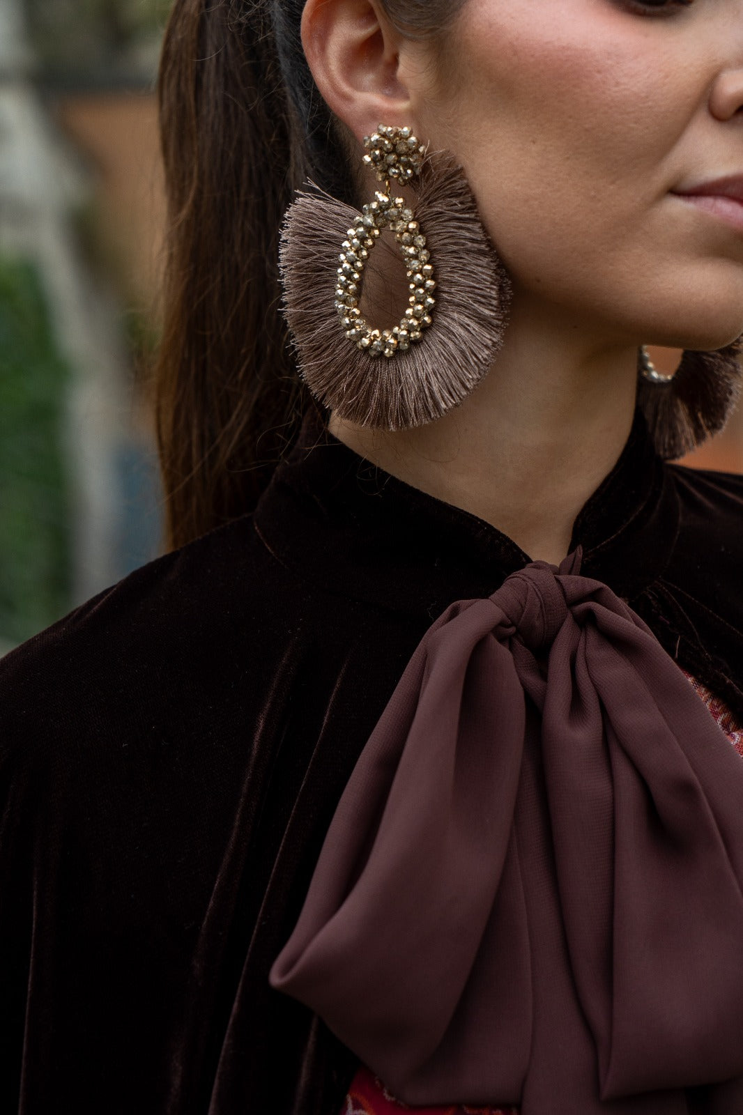 Brincos com fecho de rosca, em forma de gota com pedras e rodeados por franjas, em castanho.