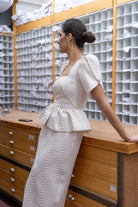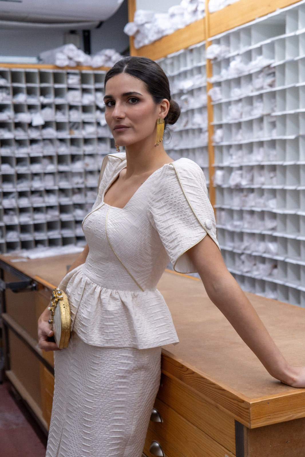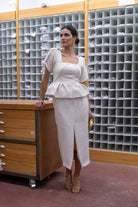 Vestido midi, escote cuadrado, manga corta y abullonada, corte en cintura con peplum abertura delantera. En color beige con lurex dorado.