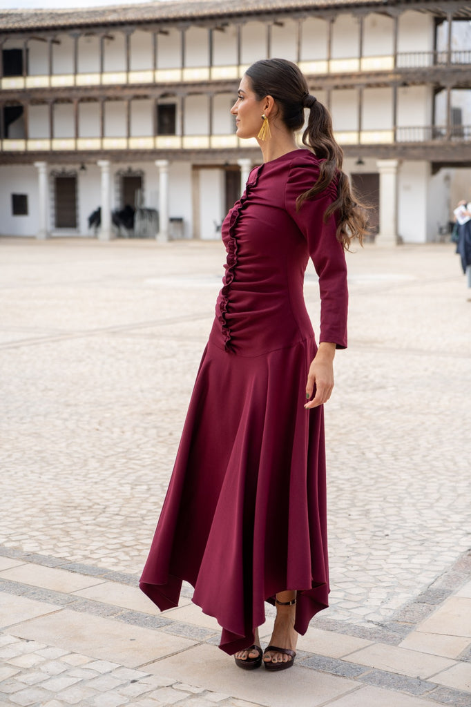 Vestido com decote redondo, mangas compridas abalonadas, detalhe franzido na frente e saia de bico fino. Na cor bordeaux.