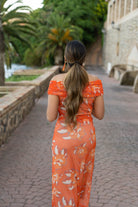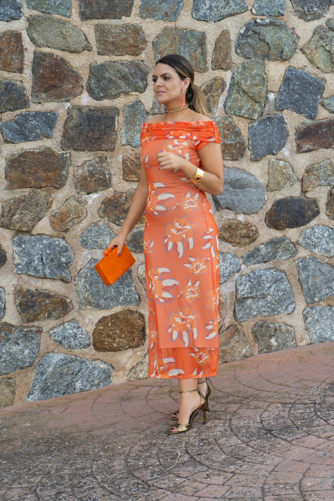 Vestido midi ombro a ombro, mangas curtas e cós totalmente elástico. Cor laranja com estampa.