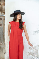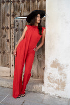 Macacão com decote redondo, costas abertas e modelo sem mangas, drapeado em um dos lados. Na cor vermelha.