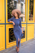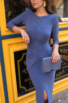 Vestir Vestido midi em malha de seda com decote redondo, mangas compridas, punhos franzidos e fenda frontal. Em azul.