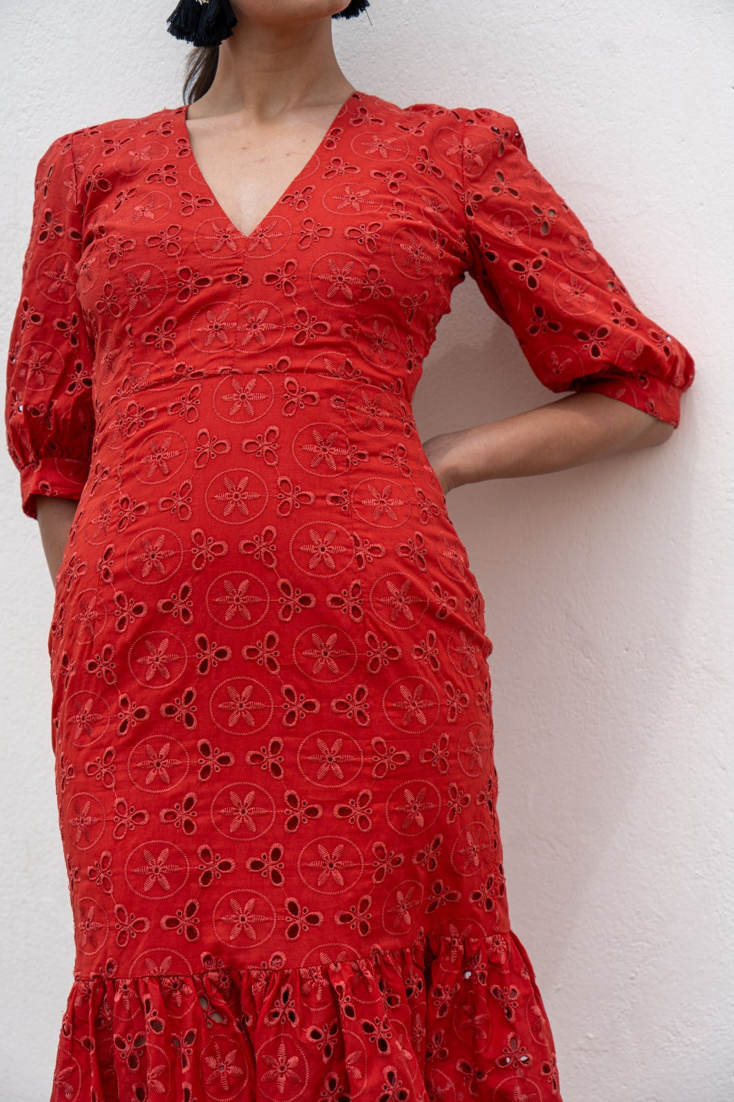Vestido com decote em V, costas abertas, mangas curtas e babado na barra. Renda e bordado em acabamento na cor caldeira.