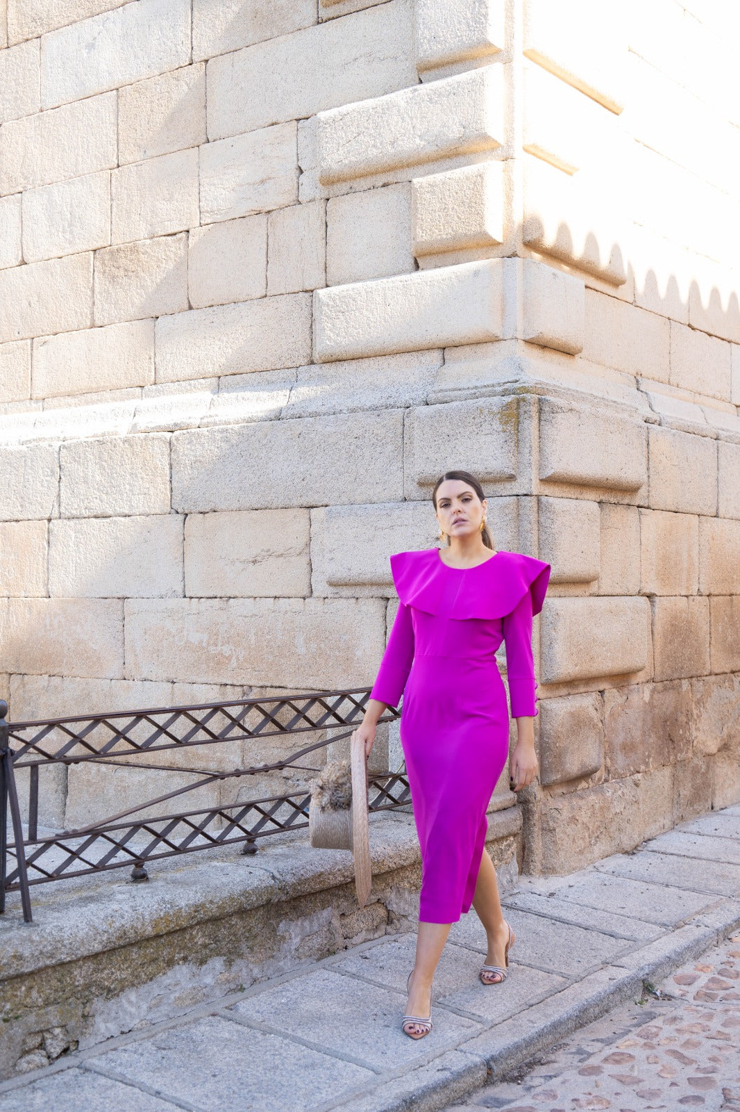 Vestido midi com decote redondo e babado na parte superior, mangas três quartos com punhos abotoados, cintura marcada e fenda nas costas. Na cor rosa.