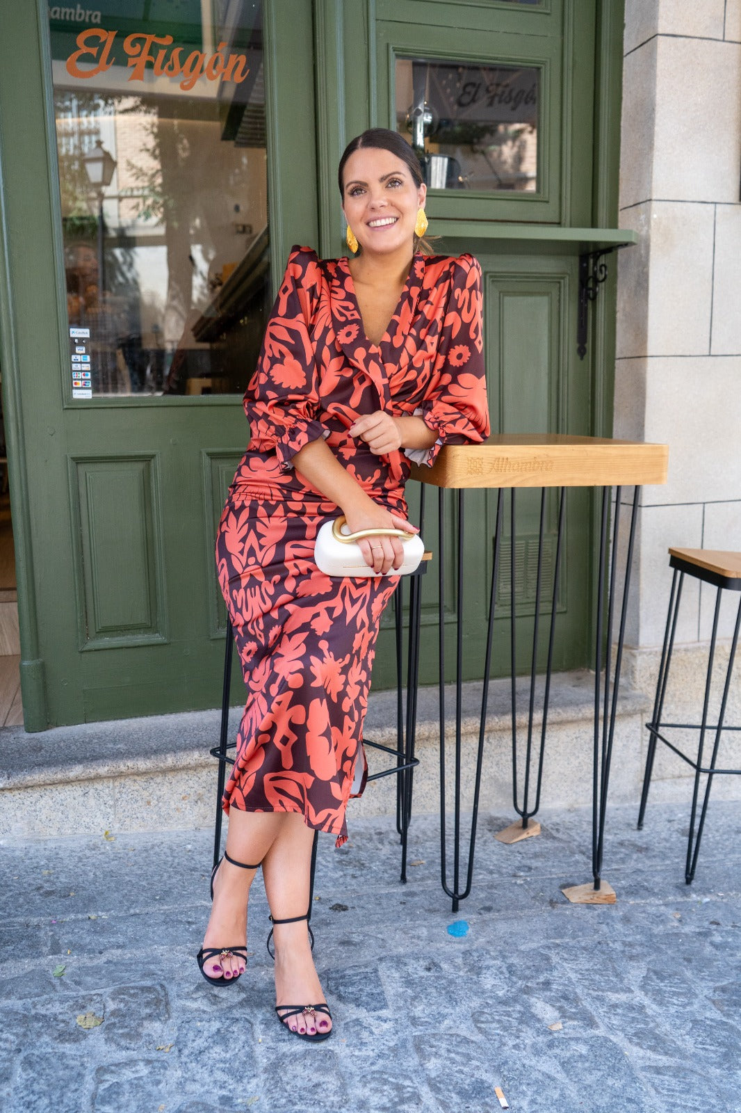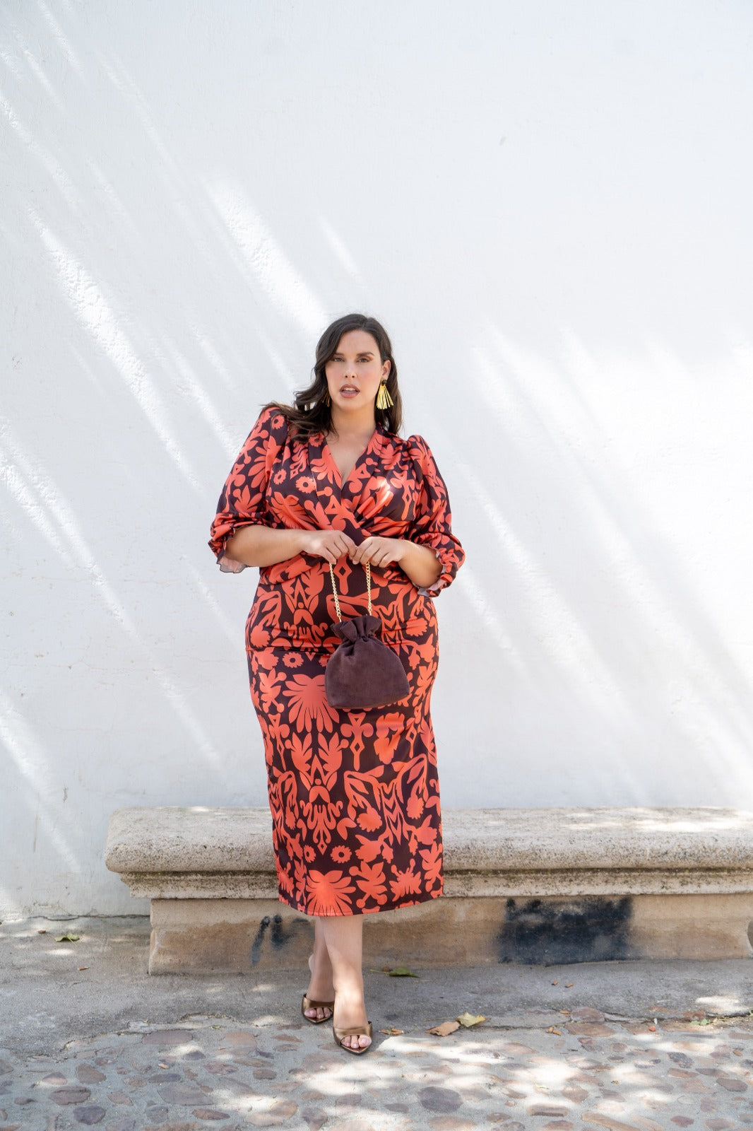 Vestido midi com decote cruzado, manga a três quartos com punhos elásticos e racha lateral frontal. Estampado castanho e azulejo.