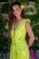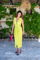 Vestido midi sem mangas com decote em V, fivela central e fenda frontal. Na cor verde-limão.