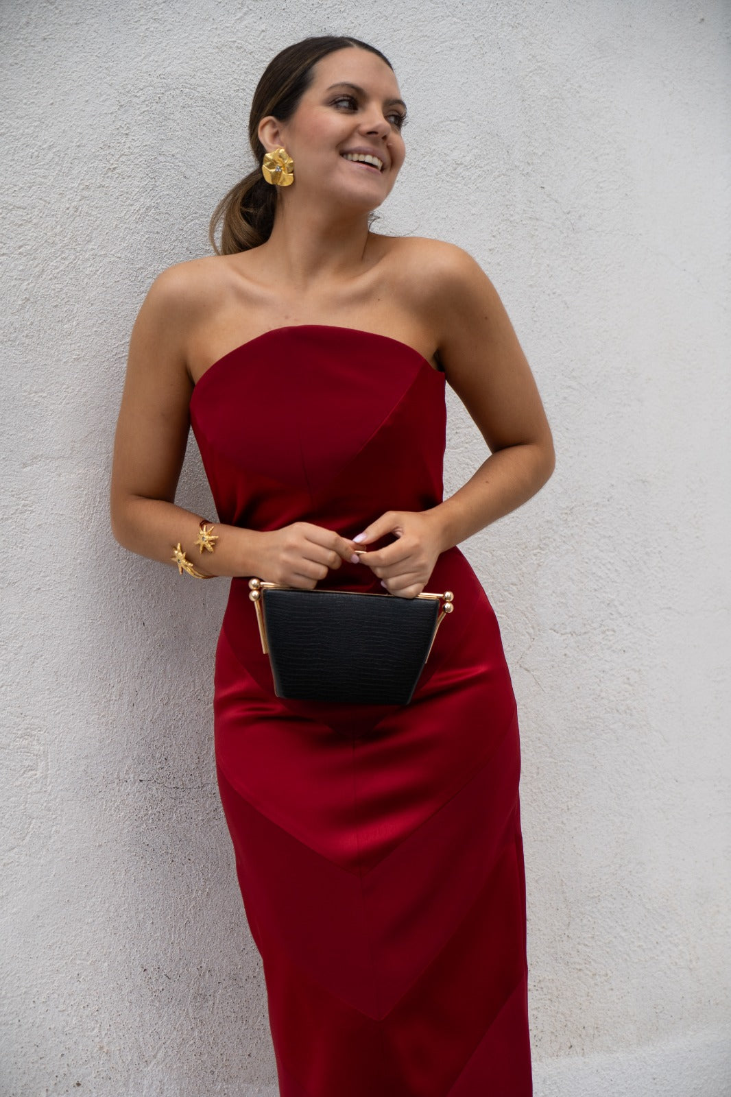 Vestido midi sem alças em triacetato com decote arredondado e recortes que brincam com o brilho e o acabamento fosco do próprio tecido, além de fenda nas costas. Em bordô.