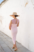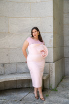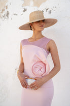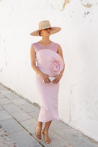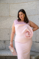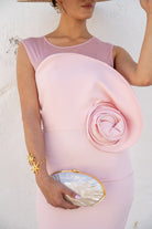 Vestido midi com decote redondo, sem mangas, top de chiffon, detalhe floral na lateral e fenda nas costas. Na cor rosa.