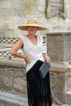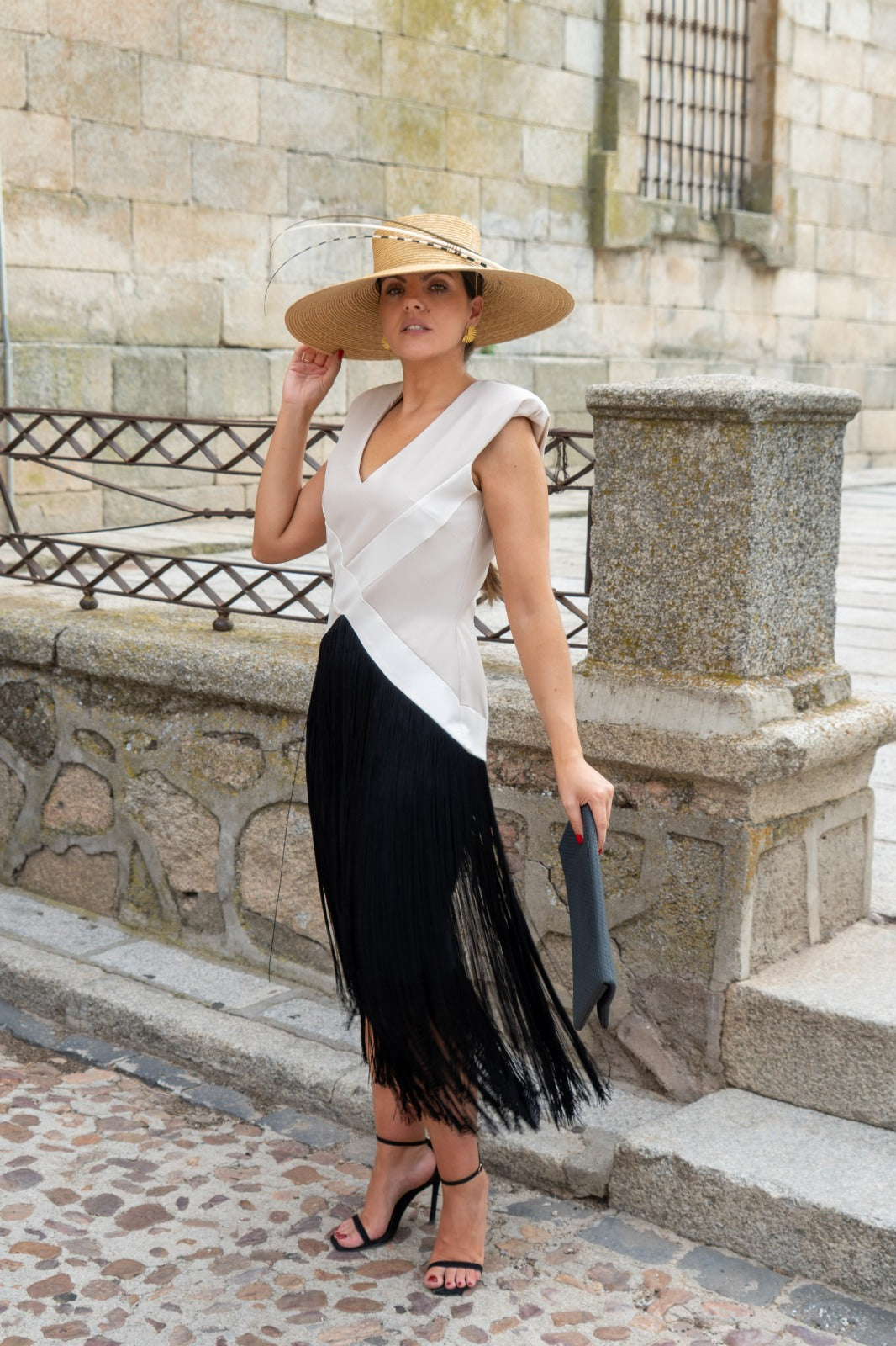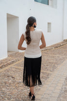Vestido midi com decote em V, sem mangas, ombreiras altas e franjas na barra. Tricolor: bege, branco e preto.