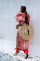 Vestido com decote em V e acabamento em nó, mangas curtas bufantes e bainha com franjas. Estampa bicolor em bege e laranja.