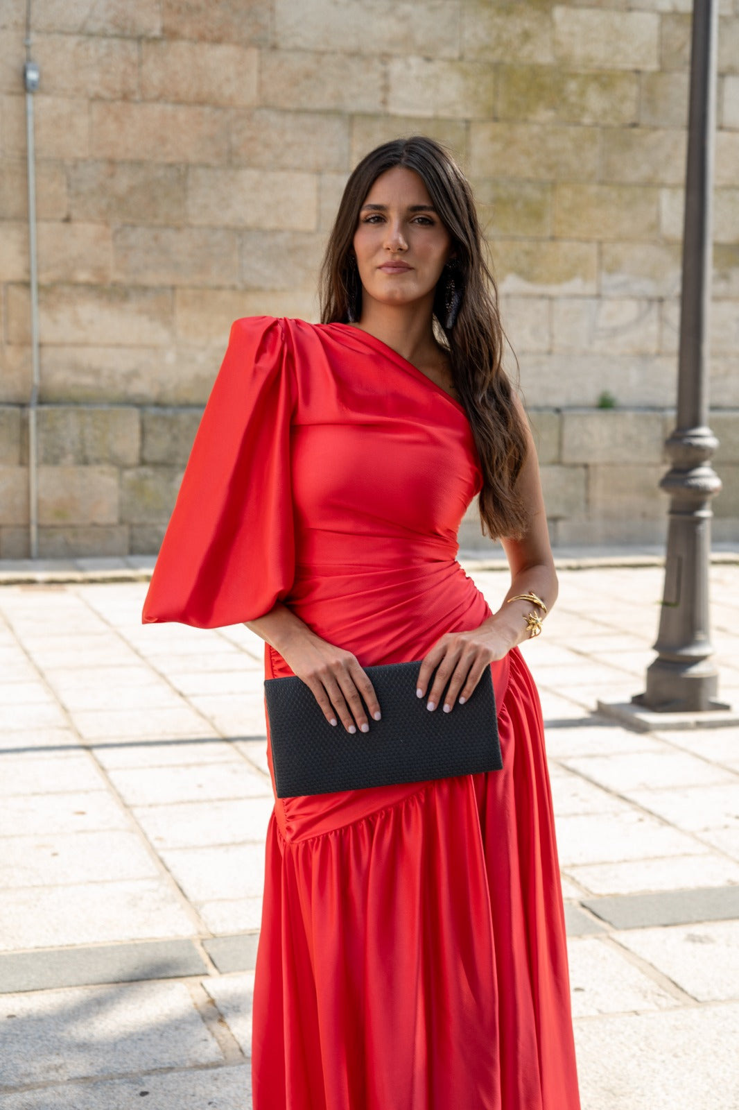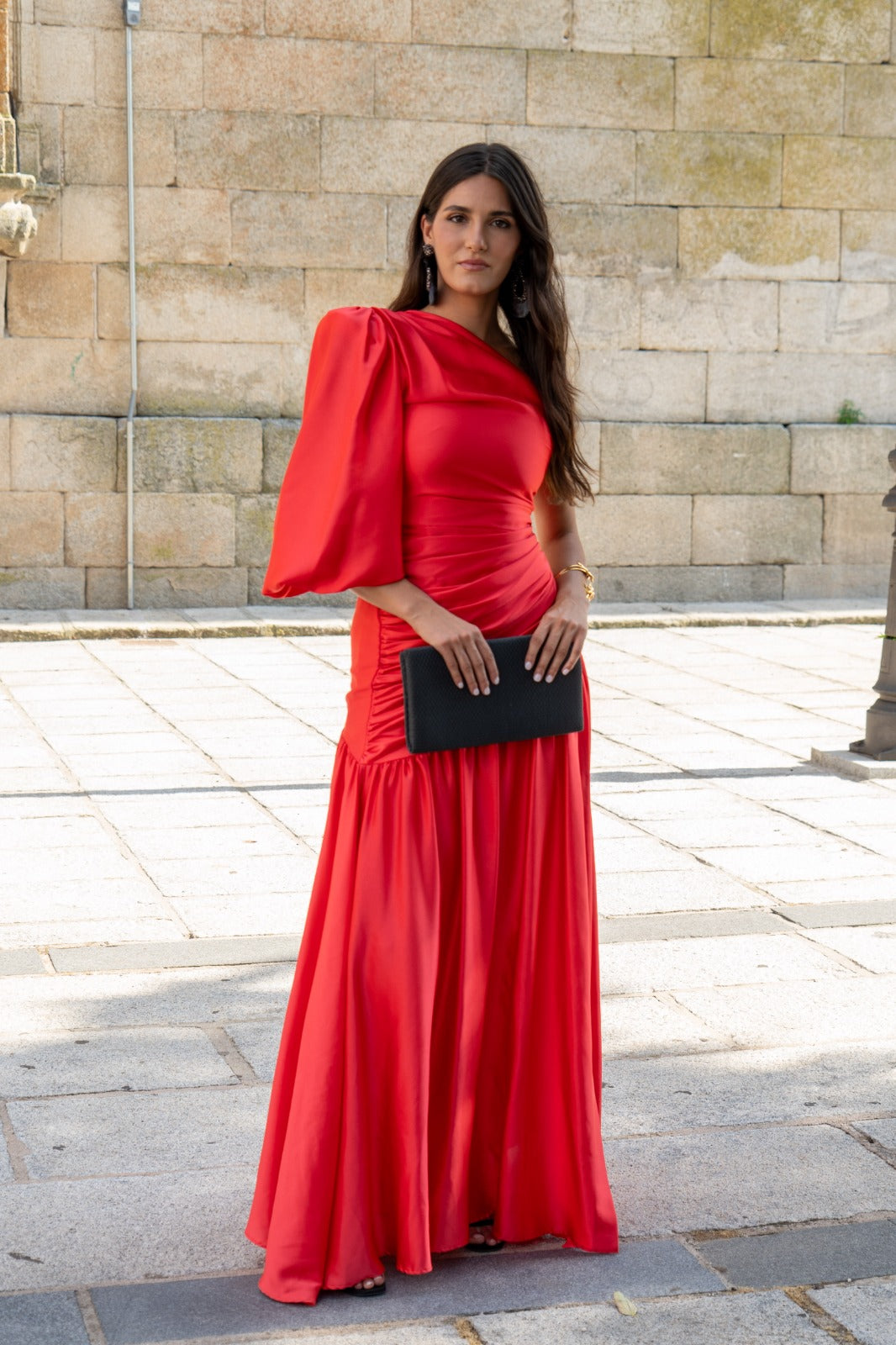 Vestido longo, assimétrico de um lado e com mangas bufantes do outro, drapeado com babado na barra. Em cetim vermelho.