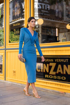 Vestido midi com decote em V e gola com lapela abotoada, manga comprida com punhos abotoados e racha nas costas. Em azul.