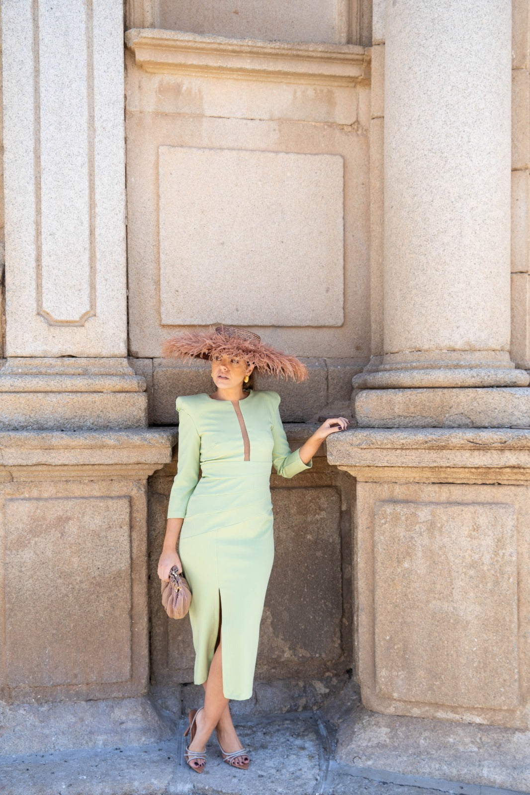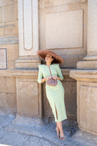 Vestido midi, decote redondo com alça transparente, manga francesa bufante no ombro, abertura frontal em um dos lados. Em verde.