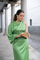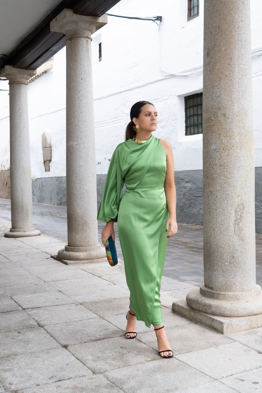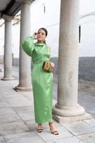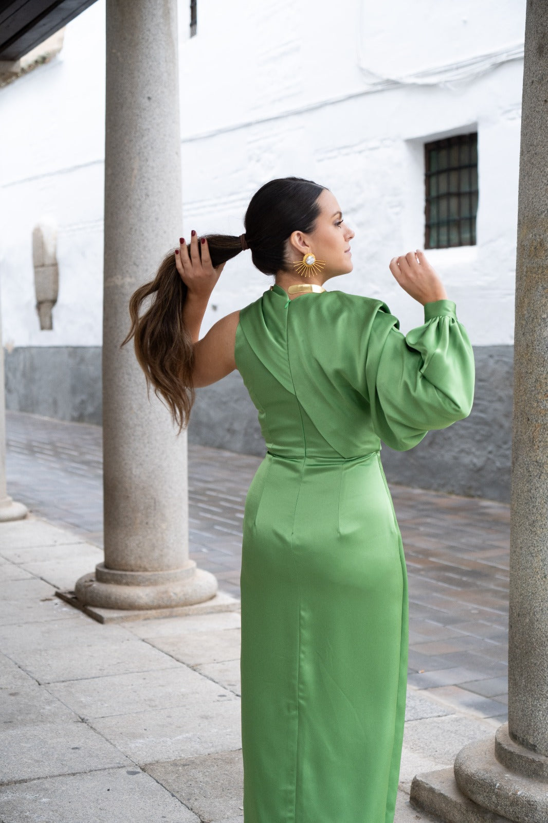 Vestido com corpo sem mangas ajustado triacetato . Blusa assimétrica que cruza o corpo, envolvendo o decote com uma única manga bufante . Saia midi reta com corte diagonal. Em verde.
