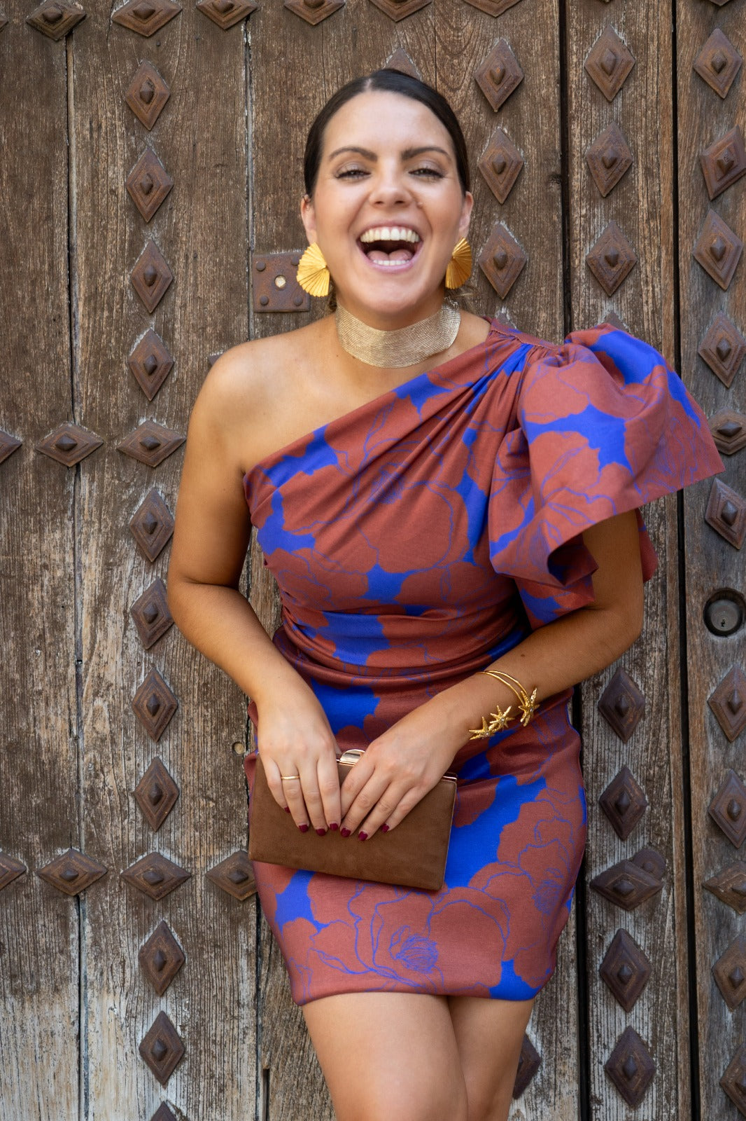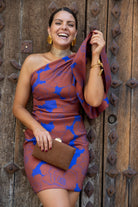 Vestido curto e assimétrico com folho comprido e cintura marcada. Feito em tafetá castanho estampado.