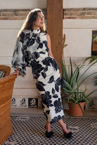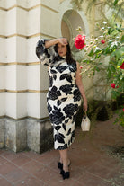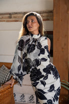 Vestido midi com decote assimétrico, capa removível de chiffon em um dos lados e detalhe transparente na cintura em outro. Estampa em preto e branco.