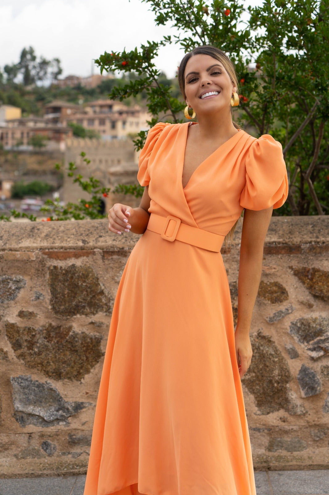 Vestido midi com decote cruzado, mangas curtas bufantes, saia rodada e cinto. Em coral.